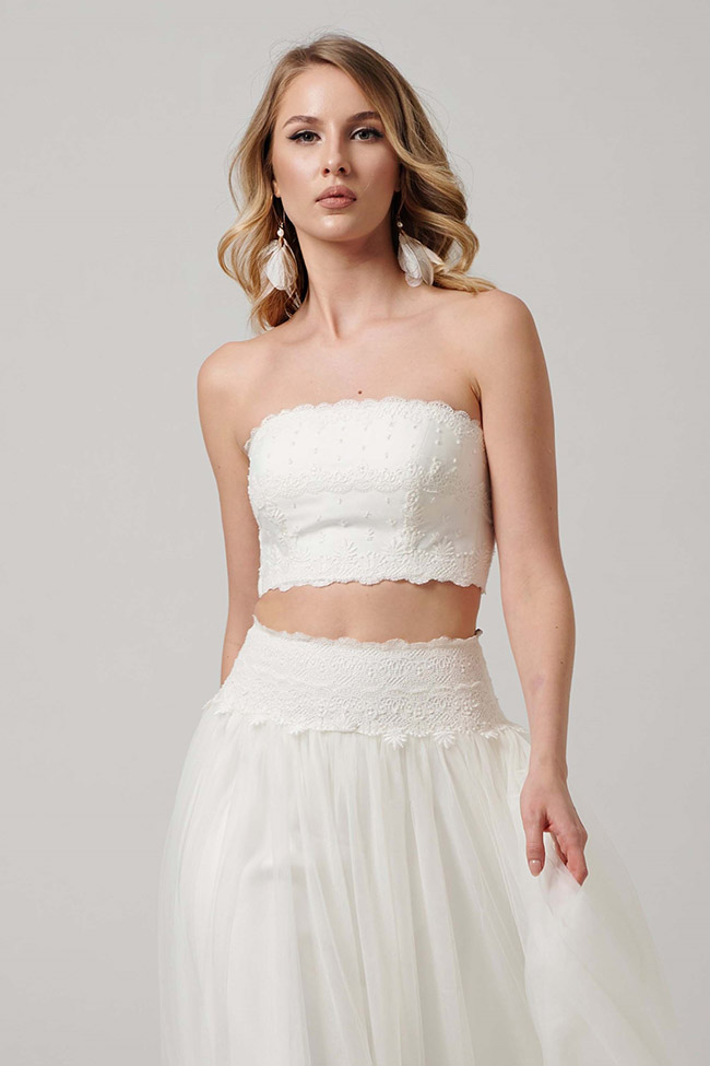 Bohaterka jednej z nowszych produkcji - Vaiana to postać, która niczego się nie boi, jest odważna i dumna. Wzorując się na jej postaci stworzyliśmy nietypowy komplet ślubny, który trafi do serc Panien Młodych, którym marzy się ślub na plaży. Delikatna, falbaniasta spódnica oraz idealnie dobrany do niej top tworzą razem spójną całość oraz nadają nietypowego i nietuzinkowego wyglądu Pannie