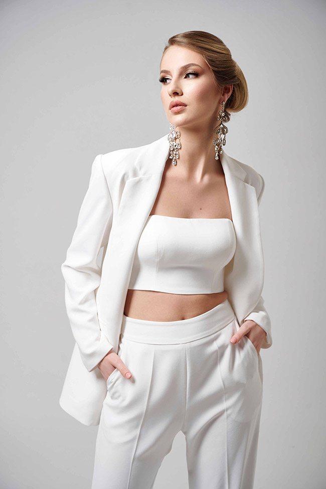 Nowoczesna księżniczka, która jest stanowcza i zdecydowana, ponieważ wie czego chce, wcale nie musi mieć bujnej sukni, Podążając za najnowoszymi trendami oraz wzorując się autorytetami z bajek z dzieciństwa stworzyliśmy garnitur, który sprawdzi się nie tylko w dniu ślubu, a będzie mógł zostać wykorzystany w czasie innych okazji, np. imprezy rodzinnej, komunii dziecka lub na co dzień