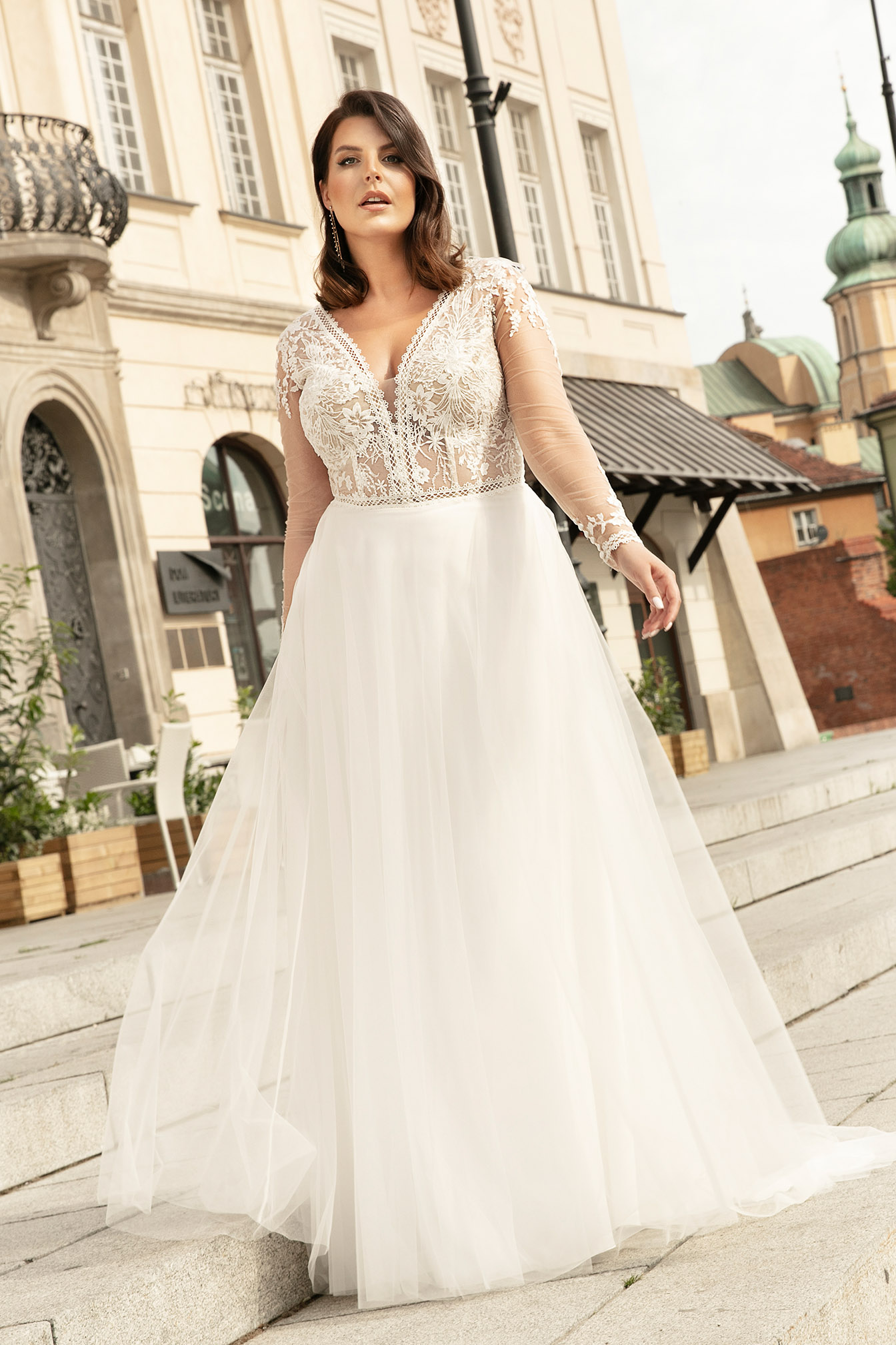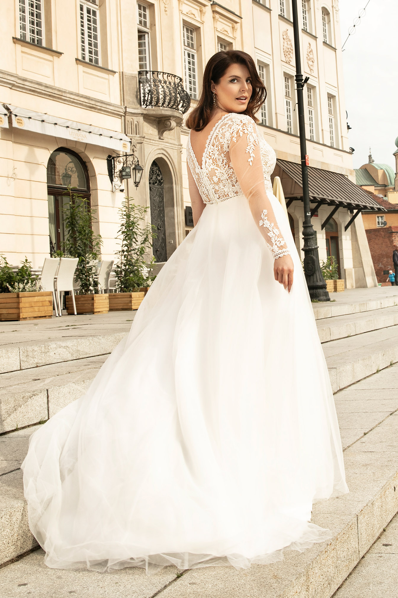 Olśniewająca i niezwykle piękna suknia ślubna. Bogato zdobiony gorset z rękawkami z tiulu cielistego. Dekolt przód, tył w kształcie litery V zmysłowo eksponuje szyję i plecy. Spódnica uszyta z trzech warstw miękkiego tiulu. W tym modelu poczujesz się zmysłowo i kobieco.