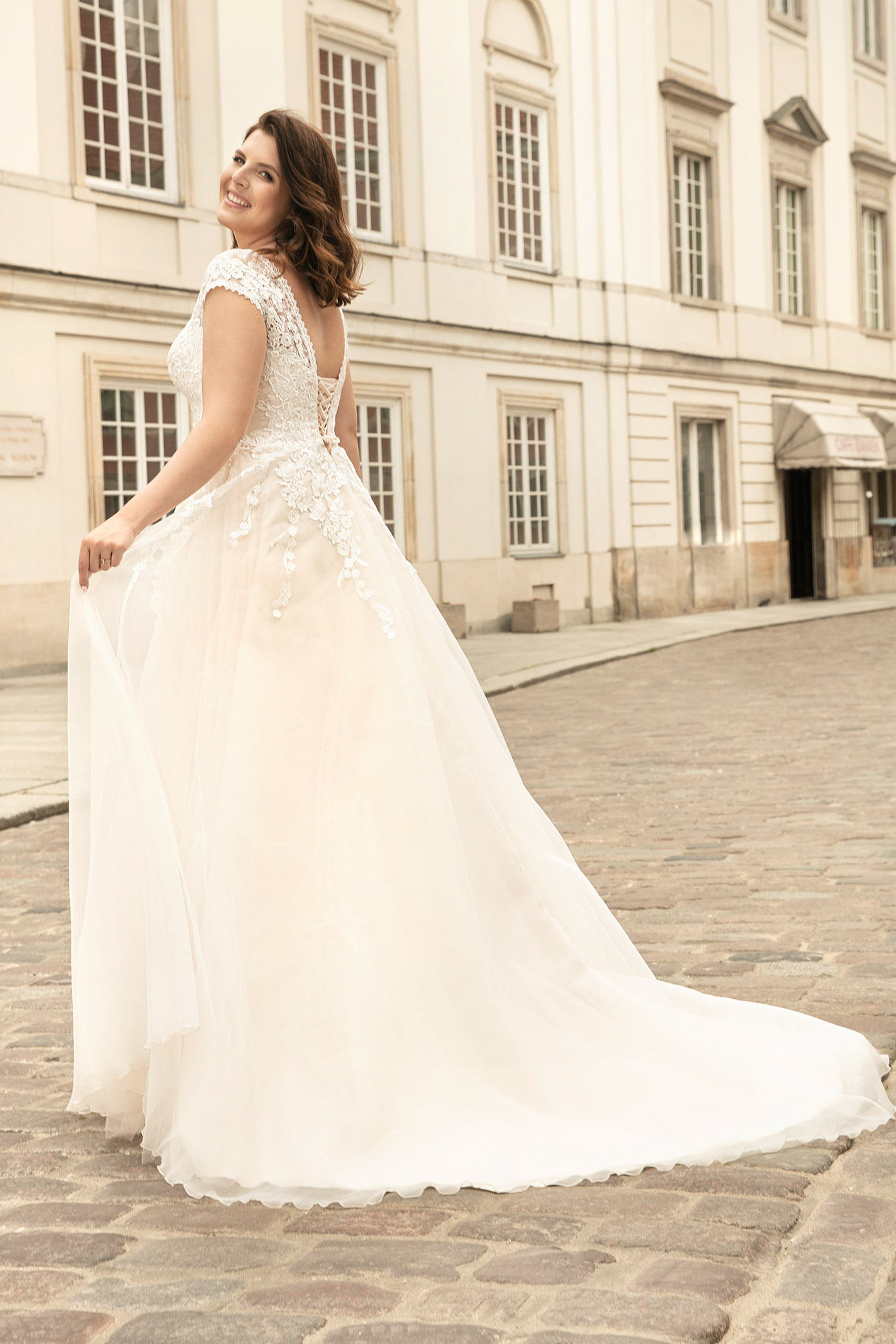 Kobieca i bardzo zmysłowa suknia ślubna na gorsecie i spódnicy zdobiona aplikacjami. Gorset z krótkimi rękawkami. Dekolt przód, tył w kształcie litery V zmysłowo eksponuje szyję i plecy. Pikanterii dodają wiązania z tyłu gorsetu. Spódnica uszyta z dwóćh warstw tiulu w odcieniu różowym oraz wierzchniej warstwy organdyny. W tym modelu będziesz emanowała eterycznym pięknem i kobiecością.