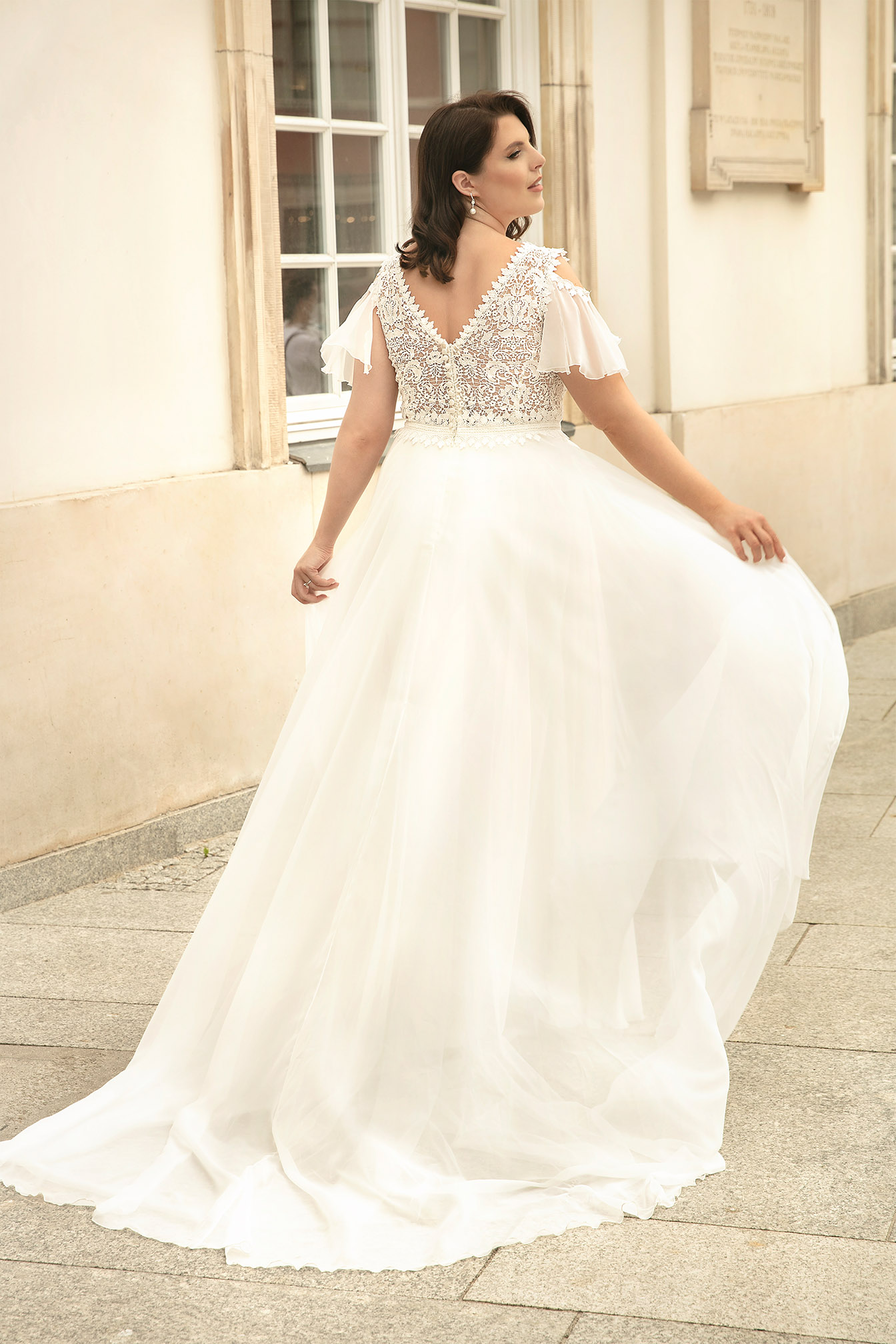 Olśniewająco piękna, subtelna i finezyjna suknia ślubna z dopinanymi rękawkami w formie falbanek, które podkreślają zwiewność całej kreacji. Gorset bogato zdobiony aplikacjami z haftu z tyłu zapinany na guziczki. Dekolt przód, tył w kształcie litery V zmysłowo odkrywa szyję i plecy .Spódnica z cienkiego szyfonu i tiulu. Model w tej estetyce wzbudzi zachwyt i zainteresowanie a ty poczujesz się lekko i zmysłowo.