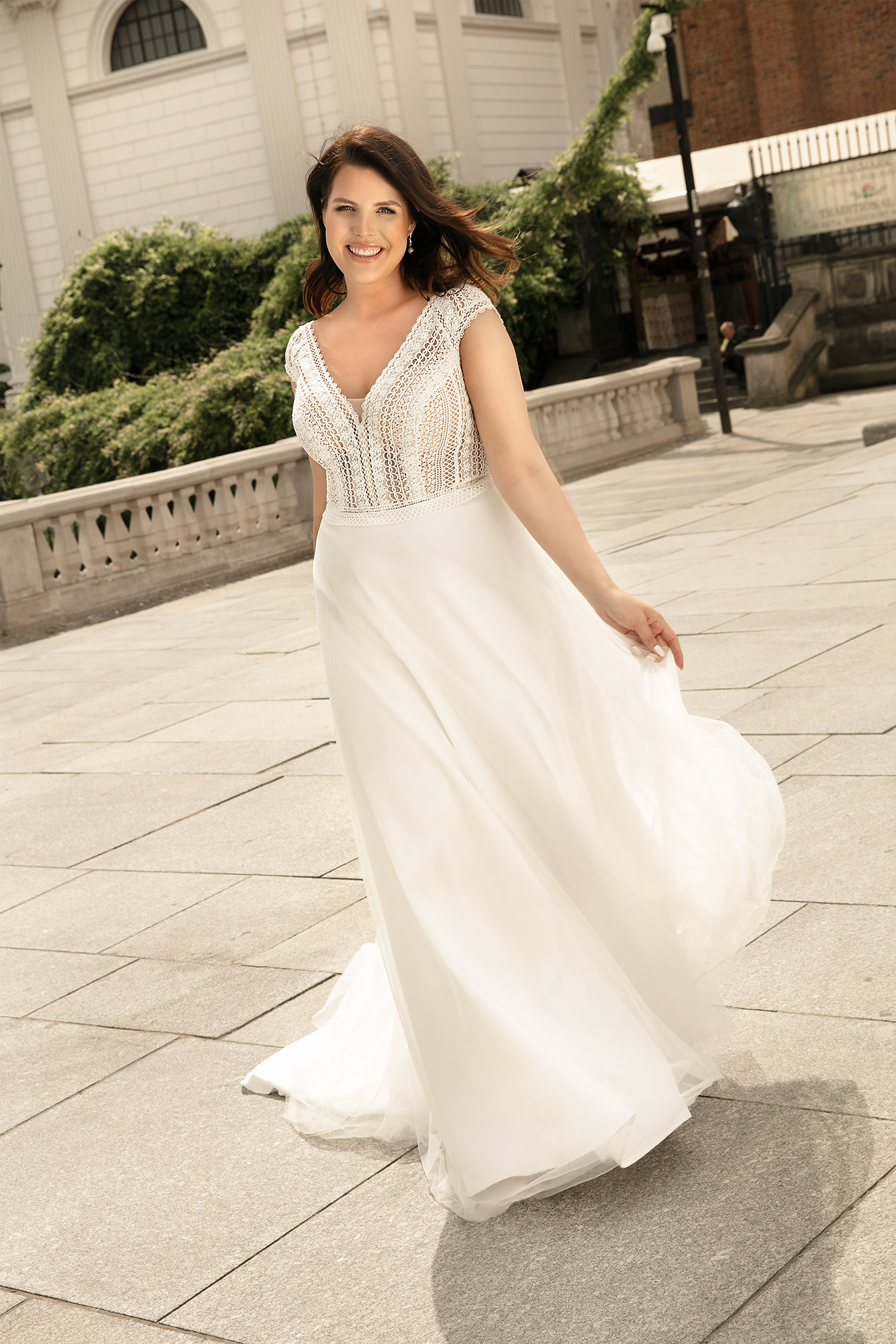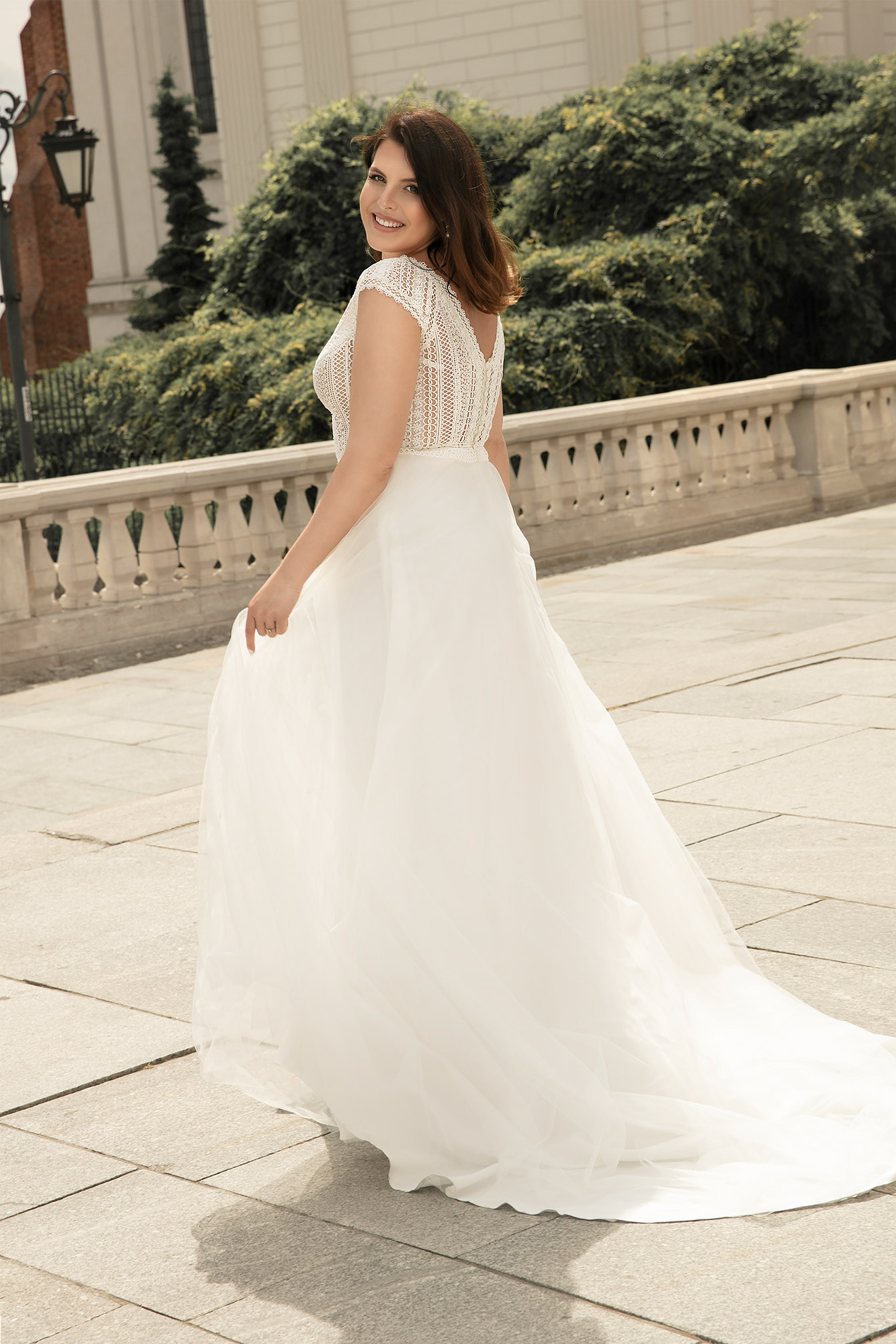 Pełna gracji, wdzięku i swobody suknia ślubna w stylu boho. Delikatny gosret z krótkimi rękawkami bogato zdobiony subtelnym haftem. Dekolt przód, tył w kształcie litery V zmysłowo odkrywa szyję i ramiona. Guziczki z tyłu gorsetu dodają pikanterii. Spódnica z trzech warstw tiulu nadaje lekkości całej kreacji. W tym modelu poczujesz się zmysłowo i kobieco.