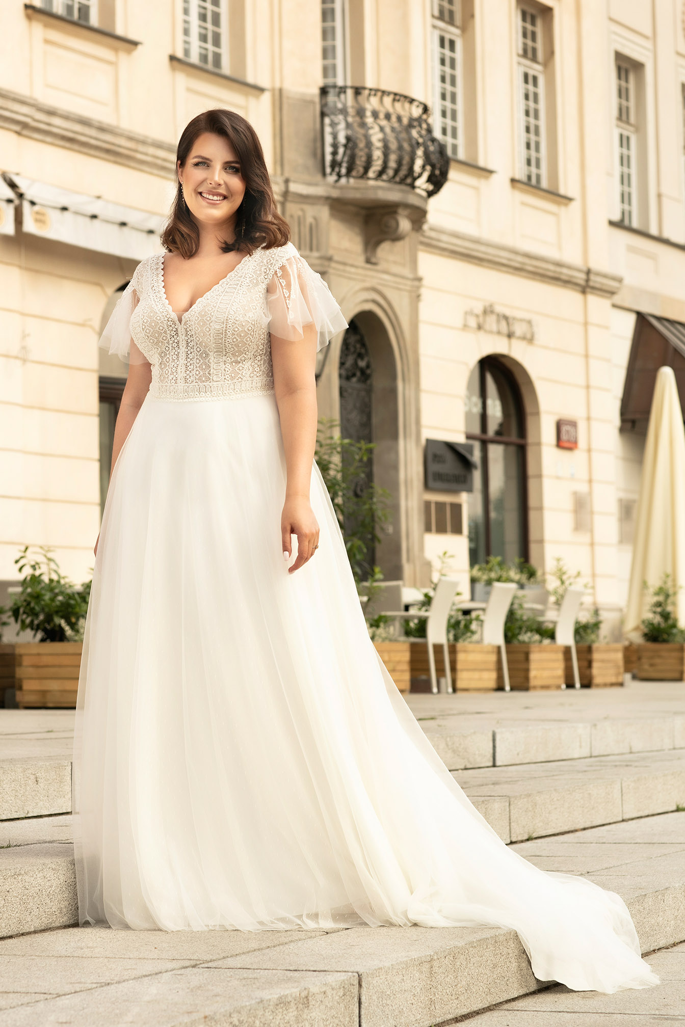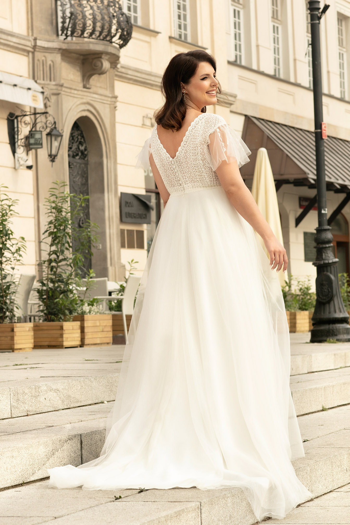 Pełna gracji, wdzięku i lekkości suknia ślubna. Wzorzysty delikatny gorset z rękawkami fruwajkami, które dodają ulotności i finezji w stylu boho. Dekolt przód, tył w kształcie litery V zmysłowo odkrywa szyję i plecy. Pikanterii dodają guziczki na końcu gorsetu. Spódnica tiulowa z trenem. Model w którym zachwycisz wyjątkową swobodą i romantyzmem.
