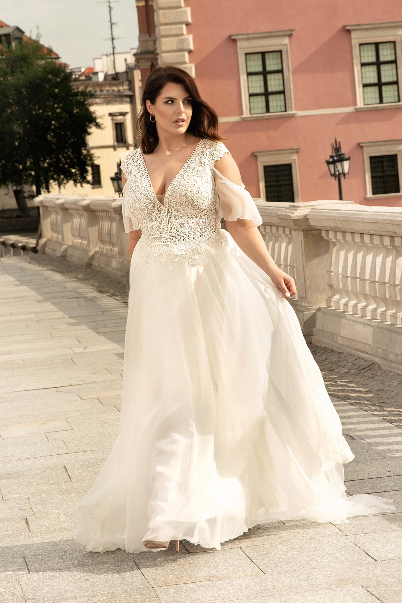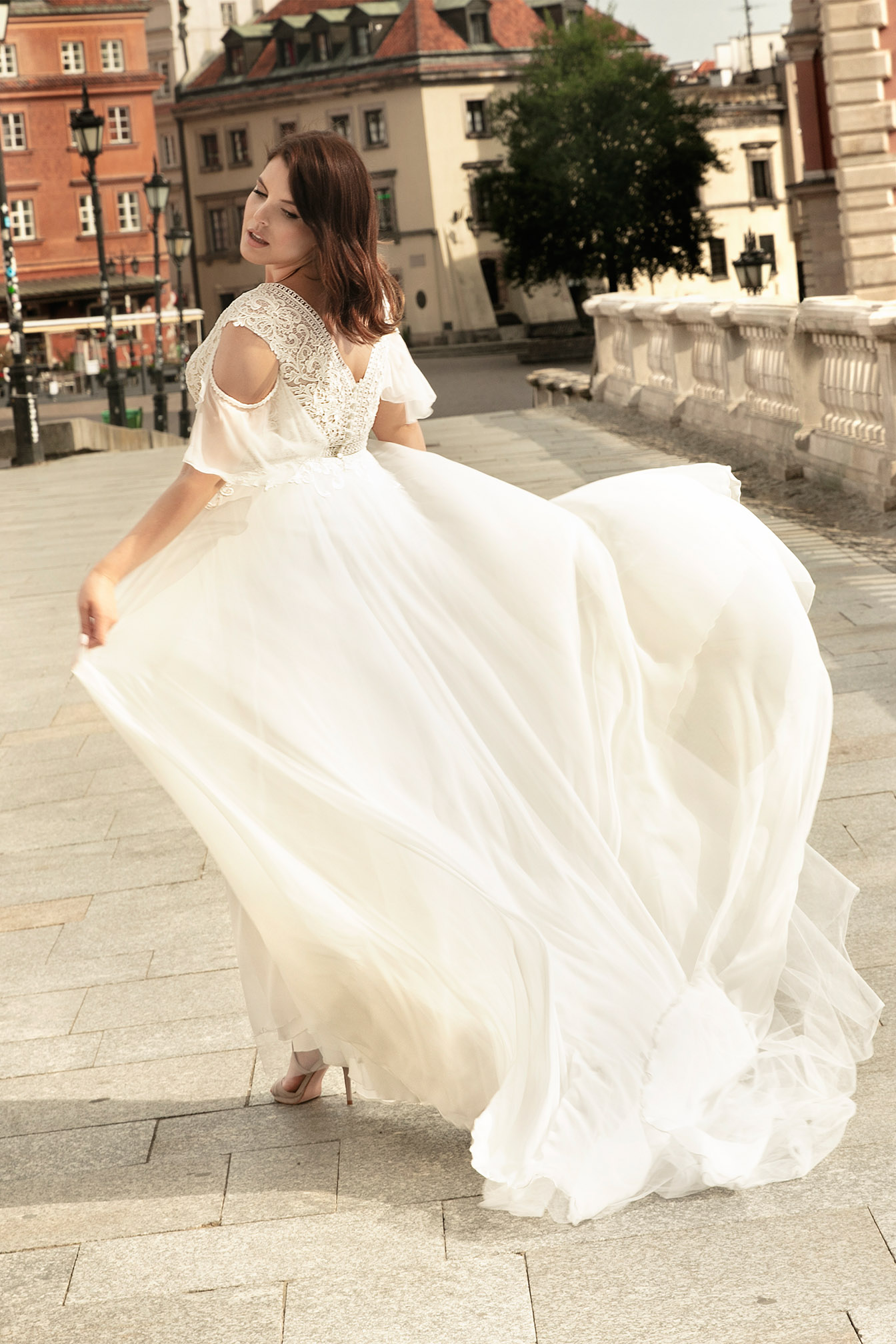 Zaperająca dech w piersiach pełna swobody i romantycznej elegancji suknia ślubna. Wzorzysty bogato zdobiony gorset z rękawkami którego aplikacje delikatnie przechodzą na spódnice wyszczuplając sylwetkę .Rękawki fruwajkami w stylu boho wykończone ozdobną taśmą nadają lekkości całej kreacji. Dekolt przód, tył w kształcie litery V zmysłowo eksponuje szyję i plecy. Guziczki z tyłu gorsetu dodają pikanterii. Piękna tiulowa spódnica jest dopełnieniem tej zjawiskowej sukni.