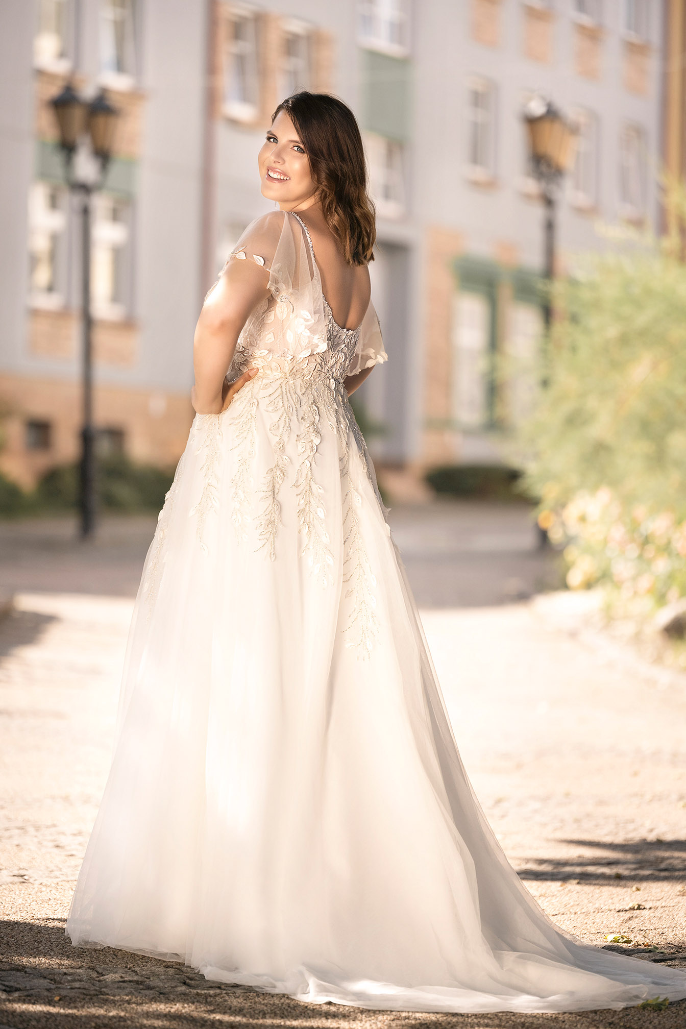 Pełna wdzięku, gracji i subtelnego piękna suknia ślubna Bogato zdobiony gorset, którego aplikacje opadają na spódnice tworząc zapierający dech w piersiach look niczym z wybiegów haute coute. Delikatne zwiewne rękawki na cienkich ramiączkach dodają lekkości całej kreacji. Zmysłowy dekolt przód, tył pięknie eksponuje szyję i plecy.Tiulowa spódnica z trenem. Model łączy zmysłowość z nutą romantyzmu .
