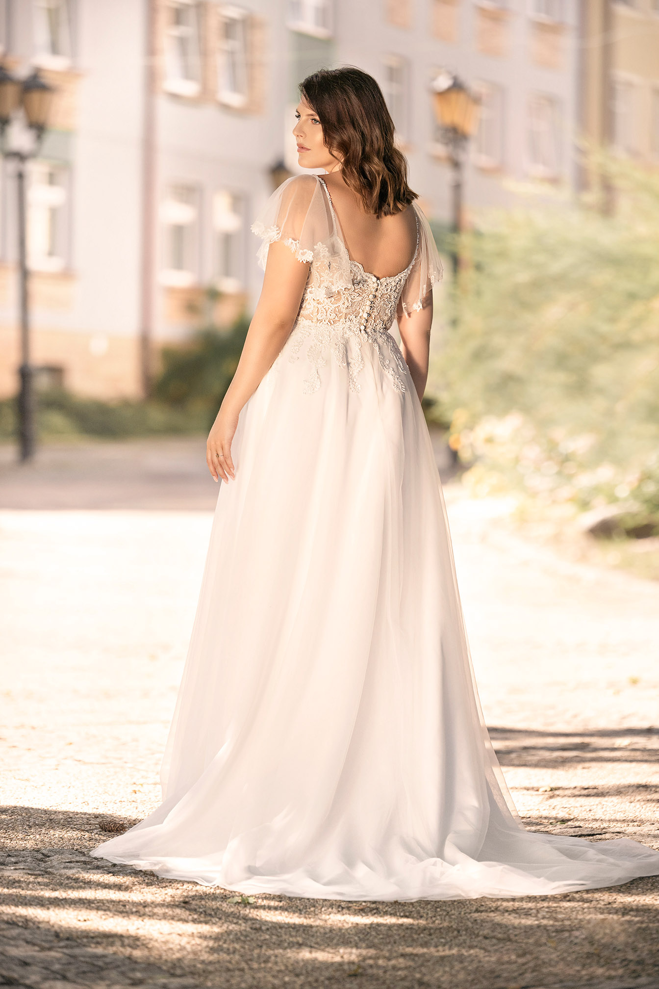 Kobieca,,pełna wdzięku i gracji suknia ślubna. Wzorzysty gorset którego aplikacje delikatnie opadają w dół spódnicy modelując sylwetkę. Finezyjne rękawki fruwajki na cienkich ramiączkach dodają lekkości całej kreacji .Zmysłowy dekolt przód, tył pięknie eksponuje szyję i plecy. Gorset z tyłu zapinany na guziczki dodaje pikanterii. Piękna tiulowa spódnica z trenem. Model w którym olśnisz swobodą i finezją.