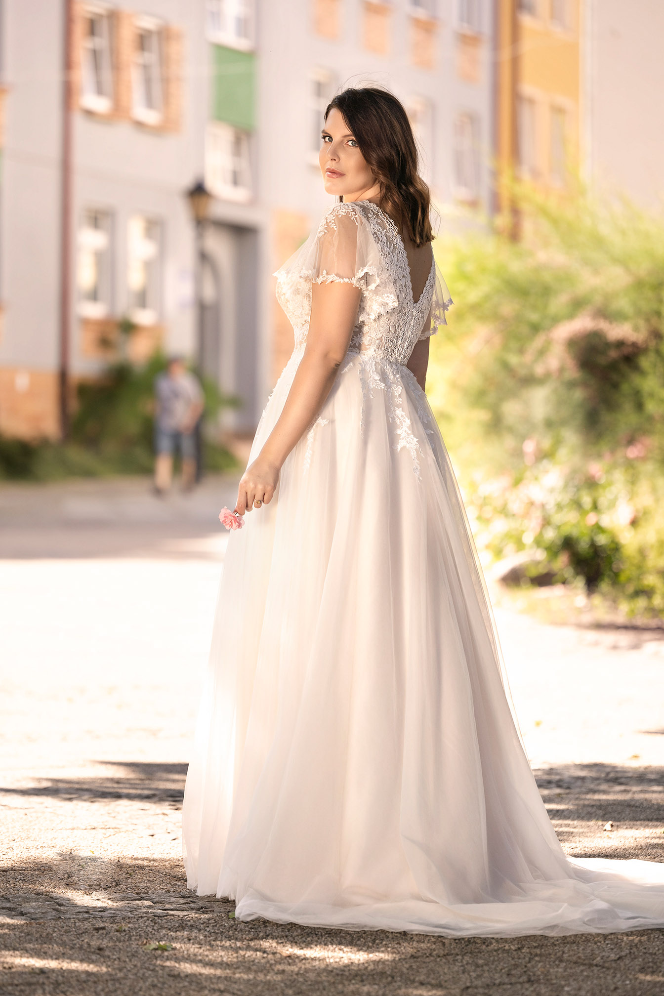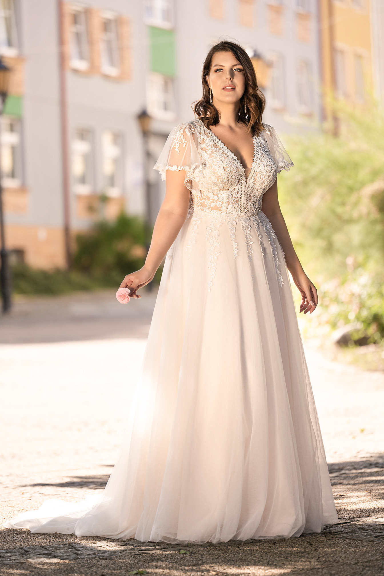 Zapierająca dech w piersiach niezwykle piękna suknia ślubna. Bogato zdobiony gorset którego aplikacje opadają na spódnice wysmuklają sylwetkę. Zdobione rękawki fruwajki w których sprawisz wrażenie lekkiej i finezyjnej. Dekolt przód, tył w kształcie litery V zmysłowo eksponuje szyję i plecy. Gorset z tyłu zapinany na guziczki dodaje pikanterii całej kreacji. Piękna tiulowa spódnica z trenem Model bardzo kobiecy w którym zachwycisz.