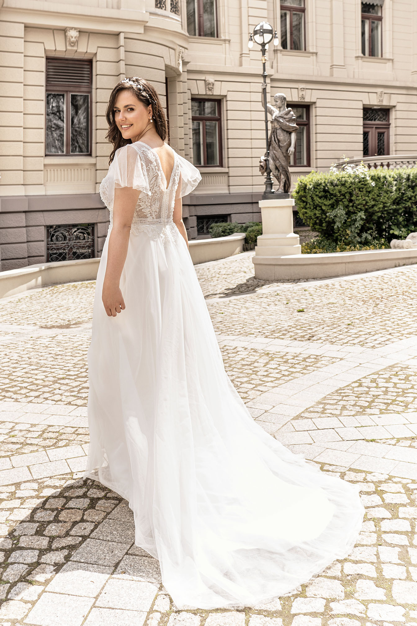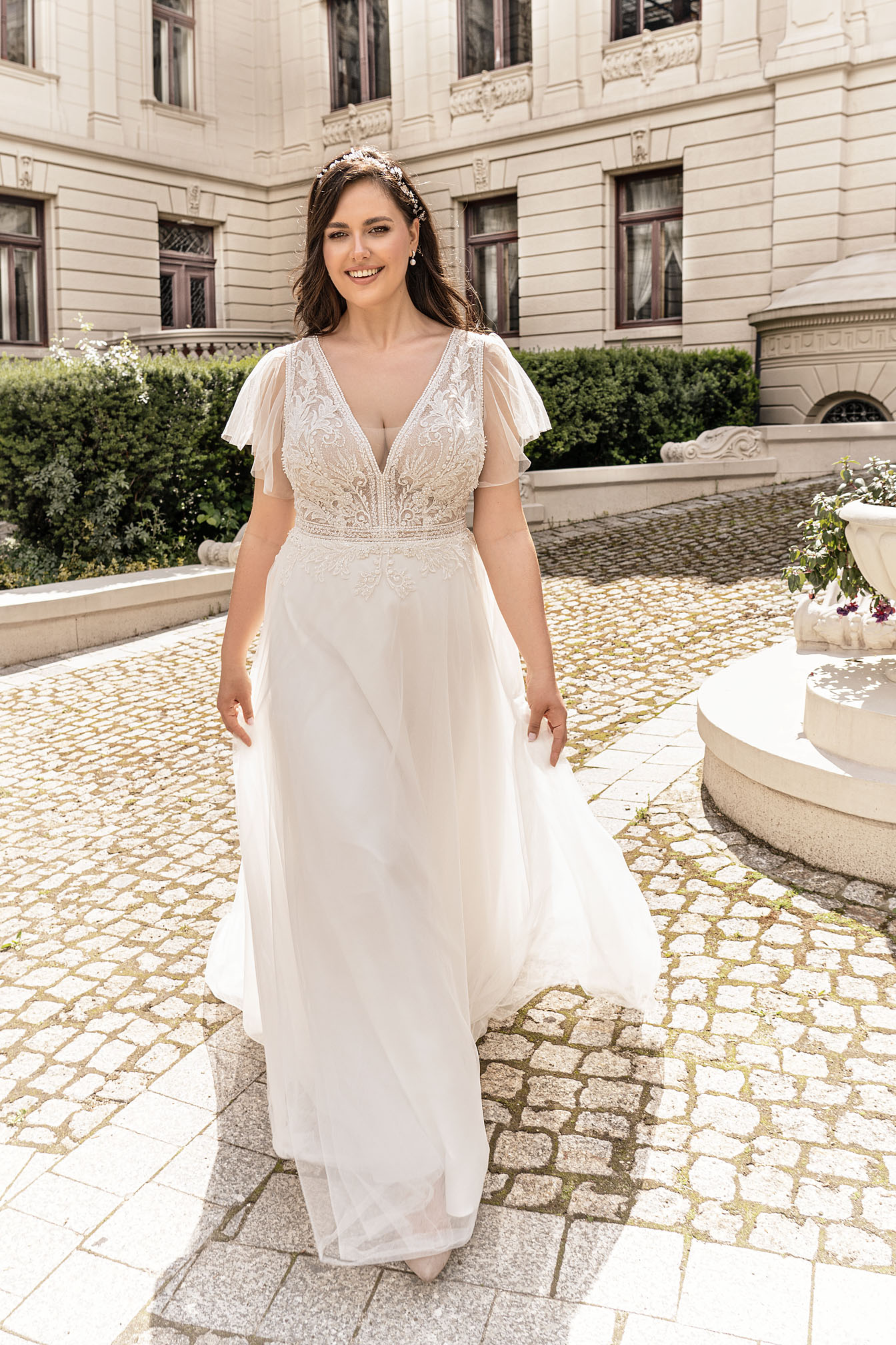 Koronkowa suknia ślubna boho z kolekcji Plus Size powstała z miłości do delikatnego stylu i romantyczności. Suknia ślubna z fiszbinami zapewni Ci pełen komfort oraz wygodę przez cały dzień, a jednocześnie podkreśli Twoje kobiece kształty. Suknia ślubna z krótkimi, zwiewnymi rękawkami jest propozycją idealną na ślub w plenerze oraz dla Panien Mlodych, które czują się pewniej w zasłoniętych ramionach. Klasyczna suknia ślubna z lekką zwiewną spódnicą, wykonanną z delikatnego szyfonu doda Ci magicznego uroku podczas tańca i da Ci gwarancję nietuzinkowego i zjawiskowego wyglądu. Klasyczna suknia ślubna z kolekcji Lovlely sprawdzi się idealnie dla każdej Panny Młodej.