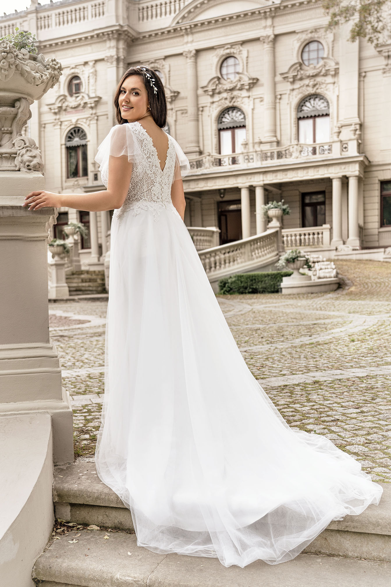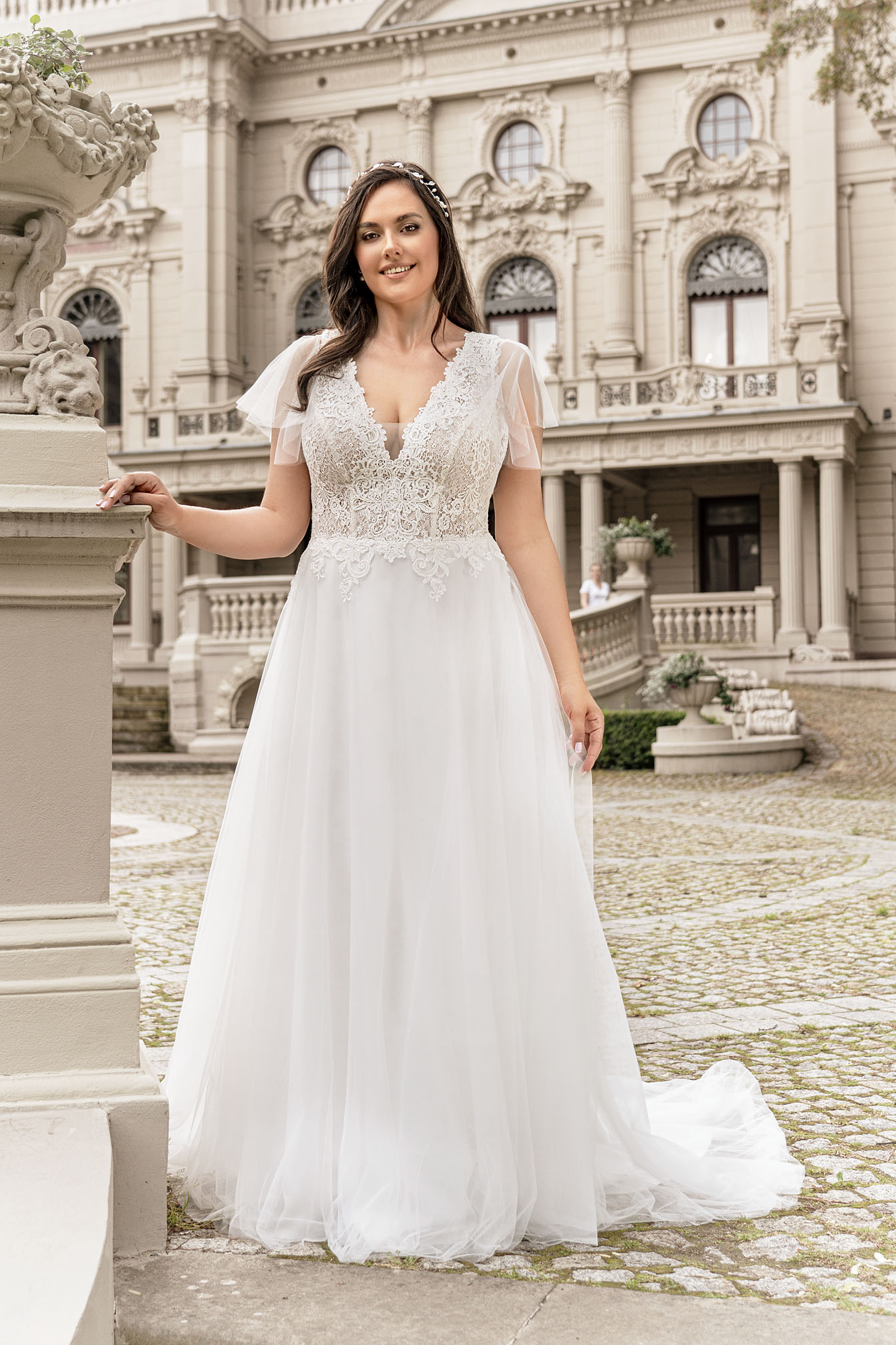 Koronkowa suknia ślubna boho z kolekcji Plus Size powstała z miłości do delikatnego stylu i romantyczności. Suknia ślubna z fiszbinami zapewni Ci pełen komfort oraz wygodę przez cały dzień, a jednocześnie podkreśli Twoje kobiece kształty. Suknia ślubna z krótkimi, zwiewnymi rękawkami jest propozycją idealną na ślub w plenerze oraz dla Panien Mlodych, które czują się pewniej w zasłoniętych ramionach. Klasyczna suknia ślubna z lekką zwiewną spódnicą, wykonanną z delikatnego szyfonu doda Ci magicznego uroku podczas tańca i da Ci gwarancję nietuzinkowego i zjawiskowego wyglądu. Klasyczna suknia ślubna z kolekcji Lovlely sprawdzi się idealnie dla każdej Panny Młodej.