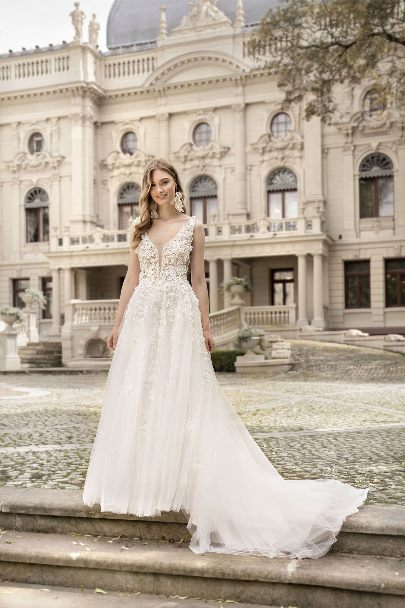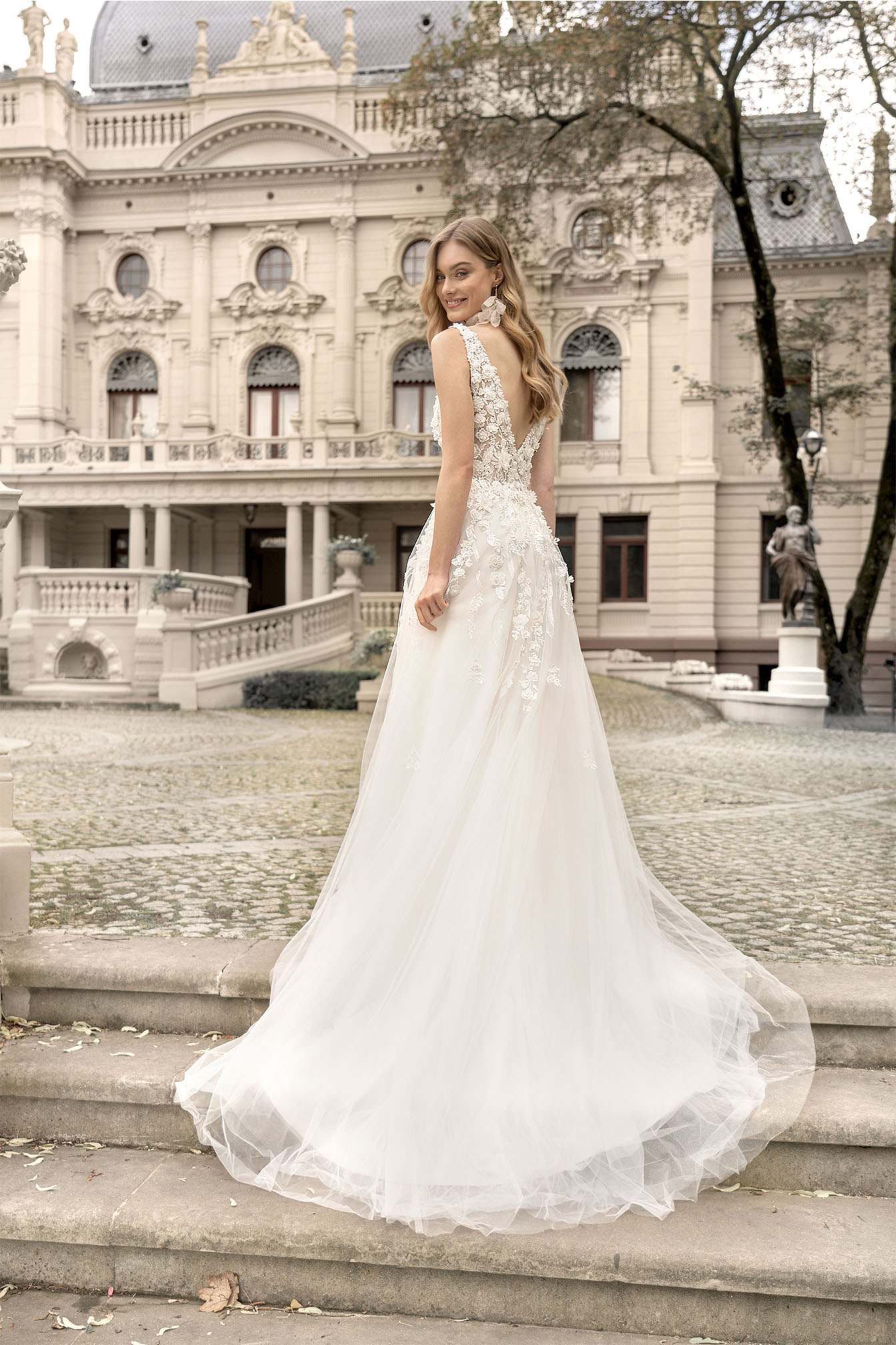 Koronkowa suknia ślubna na ramiączkach idealna dla klasycznej panny młodej. Suknia ślubna zdobiona kwiatkami 3D w stylu boho, podkreśli Twoje walory, nie podkreślając przy tym mniej reprezentatywnych części Twojego ciała. Szerokie ramiączka sprawdzą się idealnie u kobiet z węższą górą, gdyż optycznie lekko porzeszy Twoje ramiona. Suknia ślubna z odkrytymi plecami to idealna propozycja na gorącą atmosferę towarzyszącą w tym wyjątkowym dniu. Elegancka suknia ślubna to propozycja, która nie umknie żadnej pannie młodej.