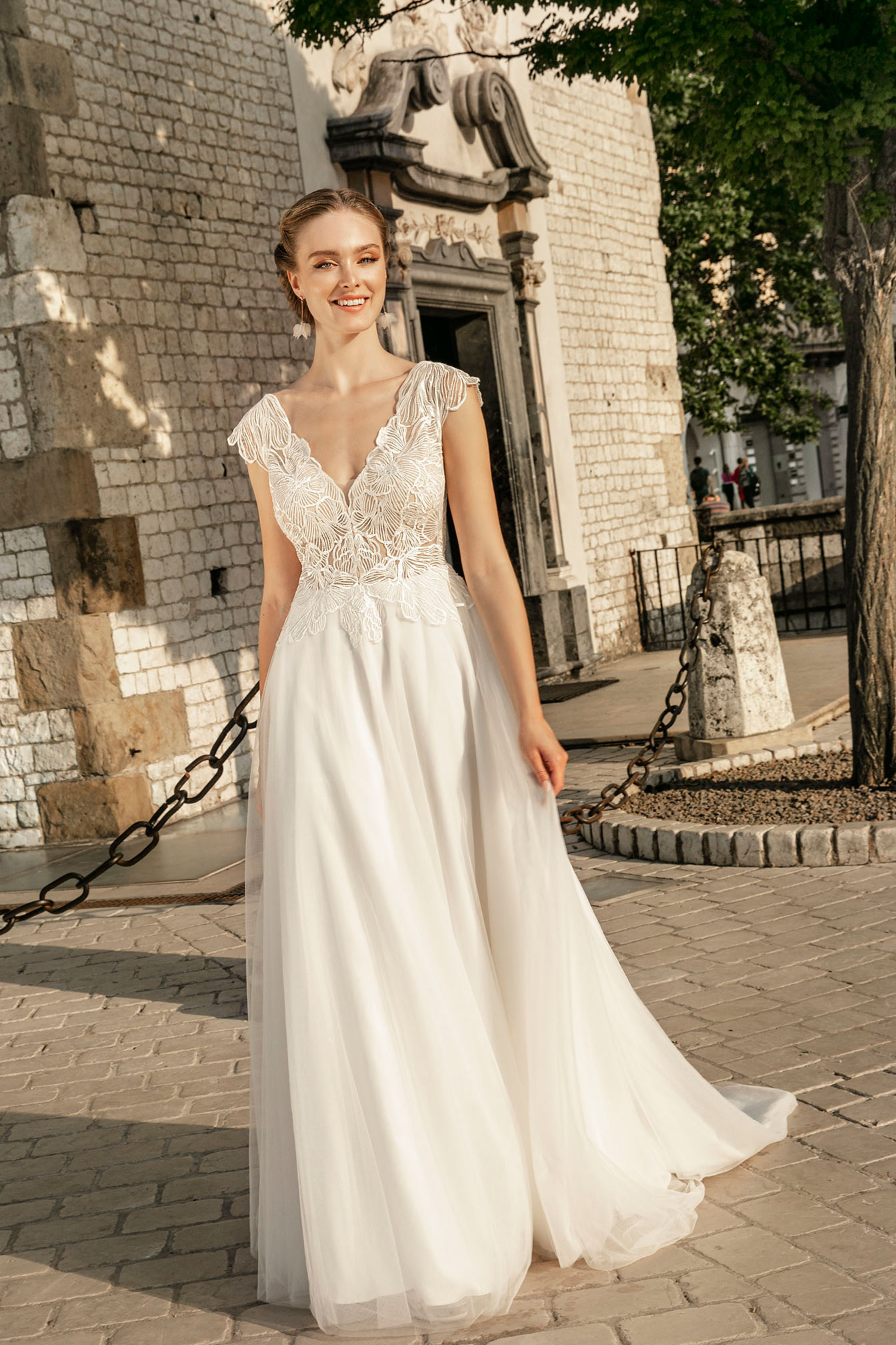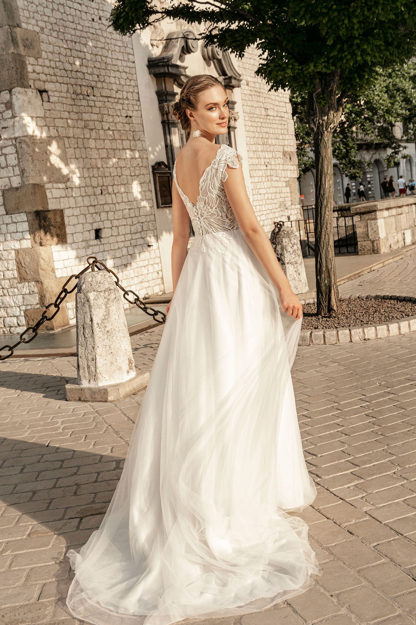 Piękna, romantyczna suknia ślubna z dekoltem z przodu oraz z tyłu w kształcie litery V, zmysłowo podkreśla plecy i szyje. Gorset i spódnica zdobią aplikacje z haftu w kolorze krem-srebro. Spódnica tiulowa. W tym modelu poczujesz się elegancko, kobieco i zmysłowo.