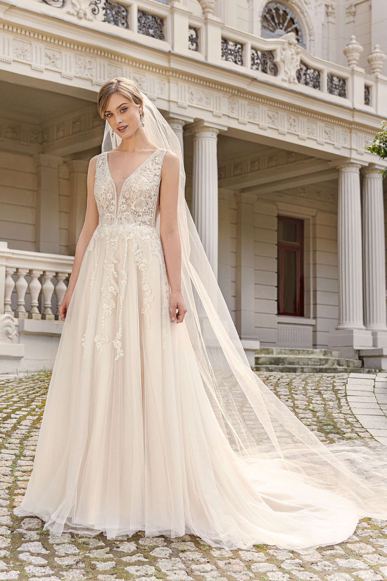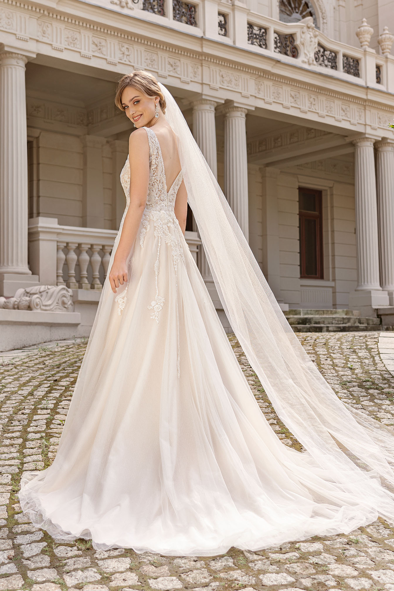 Koronkowa suknia ślubna na ramiączkach idealna dla klasycznej panny młodej. Delikatnie zdobiona suknia ślubna podkreśli Twoje walory, nie podkreślając przy tym mniej reprezentatywnych części Twojego ciała. Szerokie ramiączka sprawdzą się idealnie u kobiet z węższą górą, gdyż optycznie lekko porzeszy Twoje ramiona. Suknia ślubna z odkrytymi plecami to idealna propozycja na gorącą atmosferę towarzyszącą w tym wyjątkowym dniu. Elegancka suknia ślubna to propozycja, która nie umknie żadnej pannie młodej.