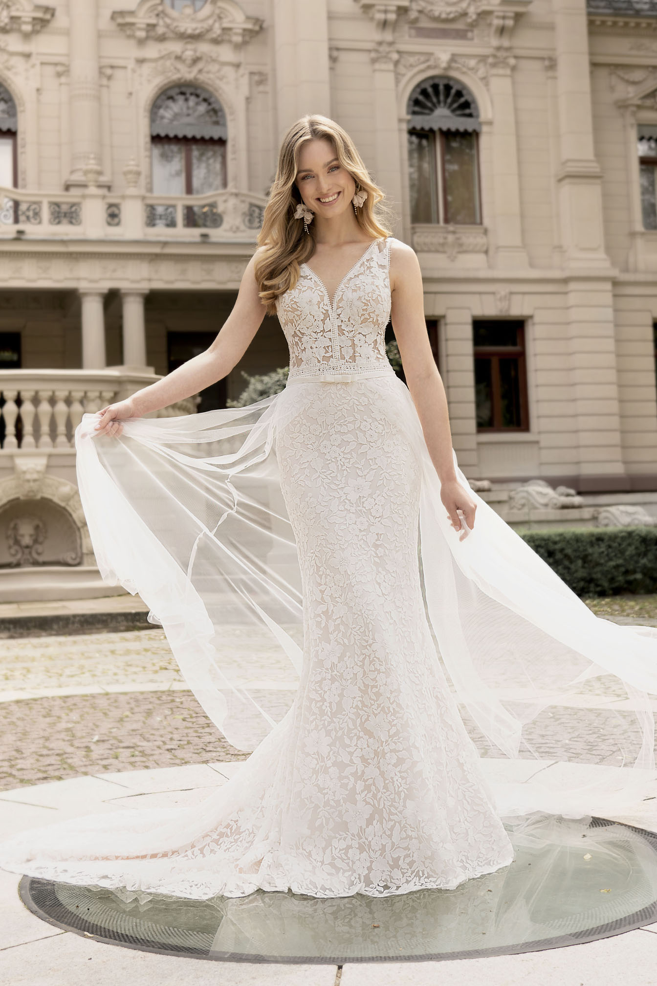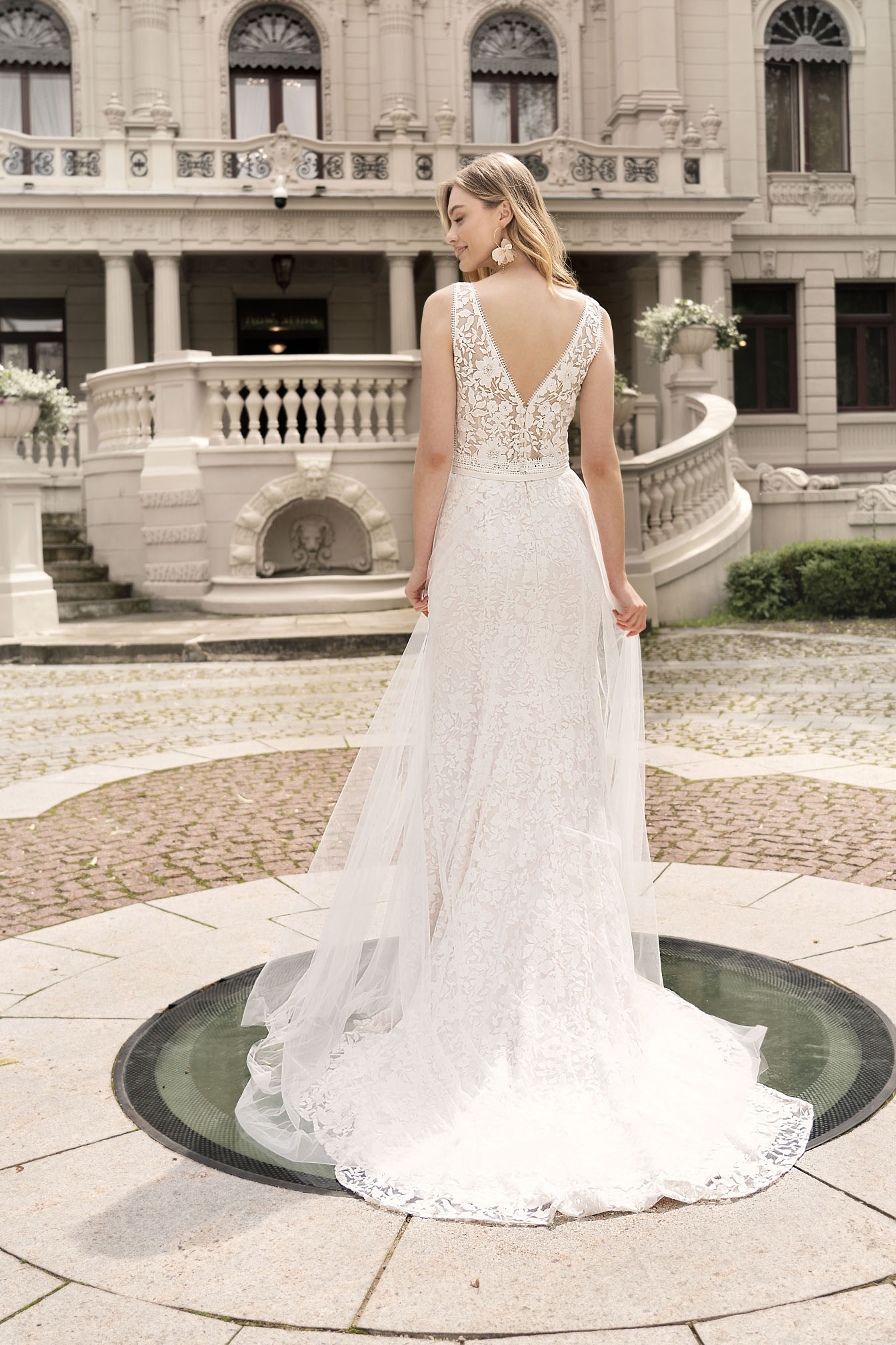 Wybierz suknię ślubną marzeń i zdecyduj się na koronkową rybkę z dopinanym trenem. Koronkowa suknia ślubna na szerokich ramiączkach zapewni Ci komfort i swobodę w dniu Twojego ślubu. Szerokie ramiączka podkreślą Twoje ramiona, a dekolt V wyeksponuje Twój biust. Suknia ślubna z głęboko wyciętymi plecami podkreśli Twoją talię. Suknia ślubna rybka to propozycja idealna dla kobiet odważnych i pewnych siebie. Koronkowa suknia ślubna cechuje się wyjątkową elegancją i szykiem. Lekki, gładki tren gwarantuje Ci dwie stylizacje o zupełnie innym charakterze.