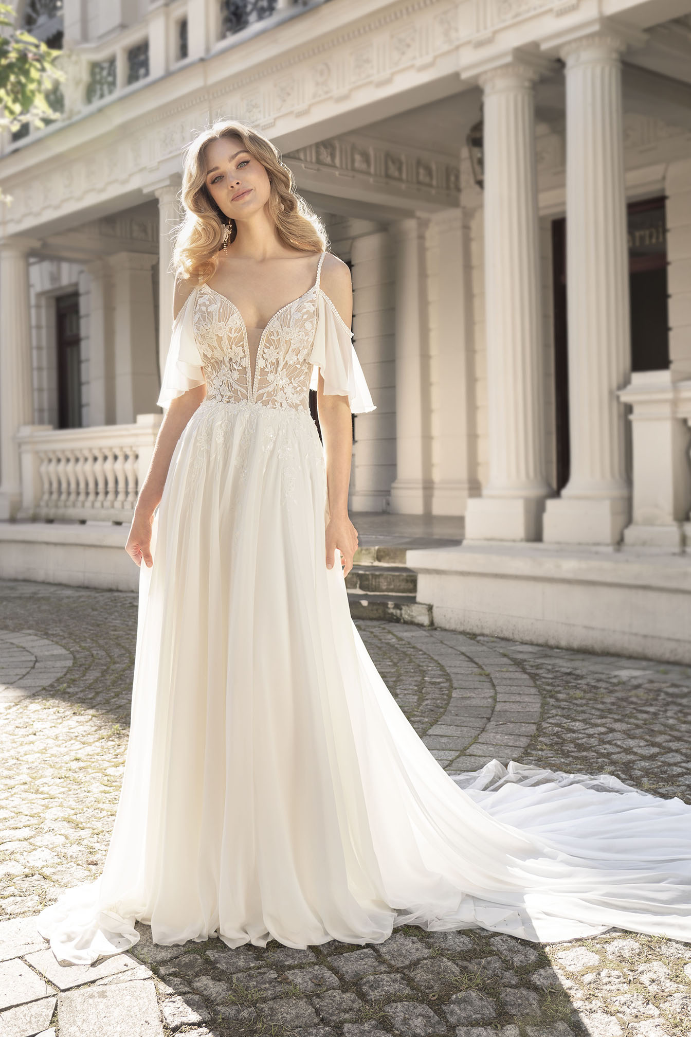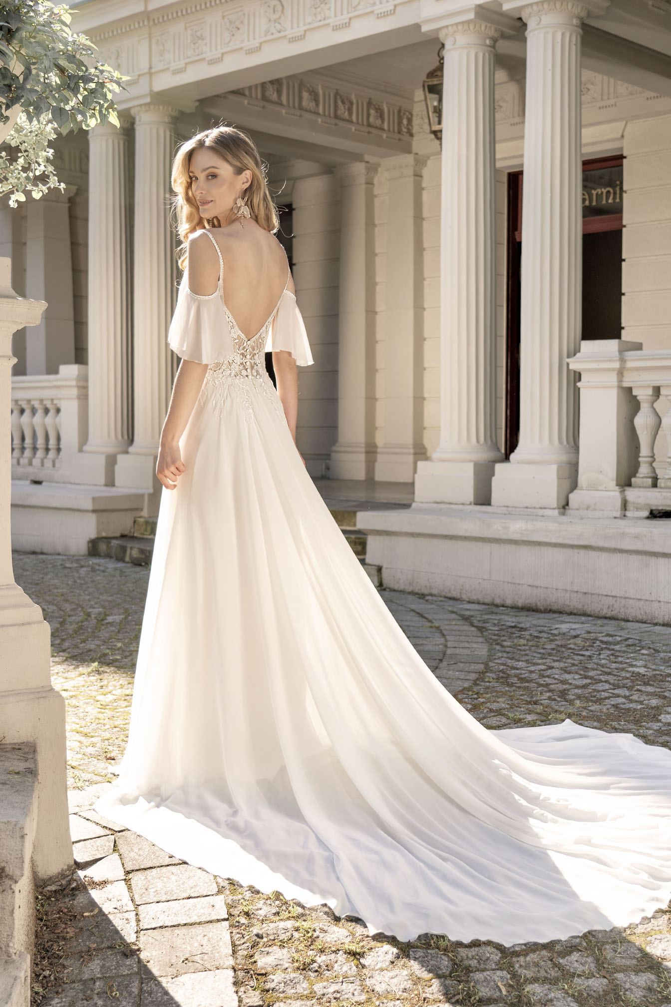 Suknia ślubna boho to propozycja idealna na ślub w plenerze jak i na sali. Lekka, zwiewna suknia ślubna podkreśli Twoją kobiecość i delikatność. Suknia ślubna z głębokim dekoltem podkreśli Twoje kształty, sprawdzi się zarówno przy większym jak i mniejszym biuście, a odkryte plecy w tym modelu sukni ślubnej spiszą się idealnie w gorącej atmosferze ważnego dnia. Suknia ślubna boho z fiszbinami zapewni Ci komfort przez cały dzień, a delikatny koronkowy materiał nie spowoduje żadnego dyskomfortu. Wybierz swoją suknię marzeń!