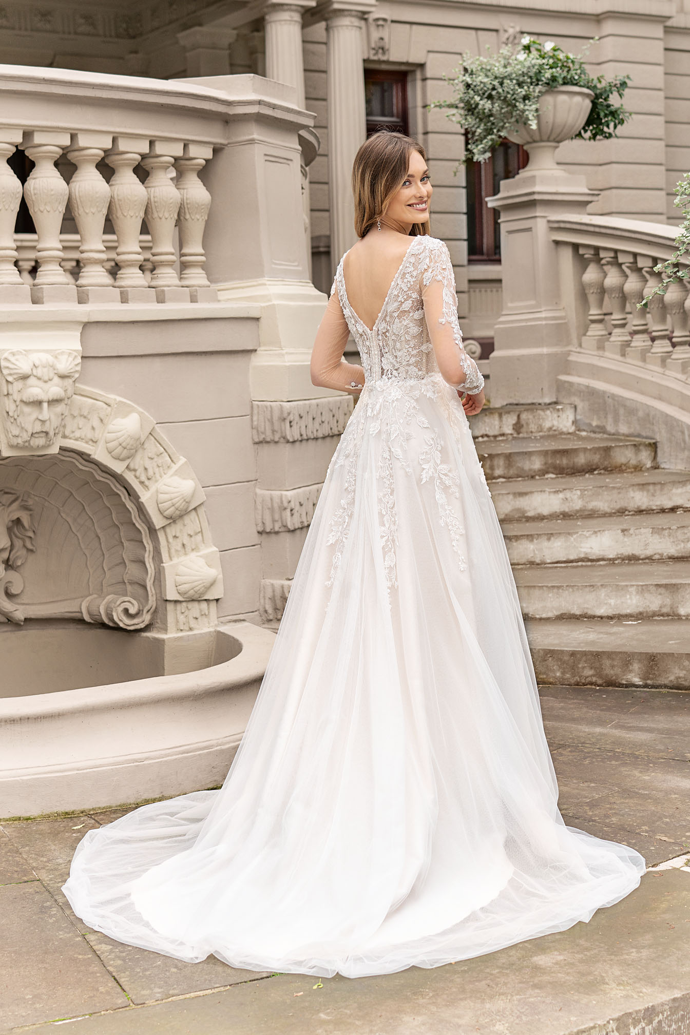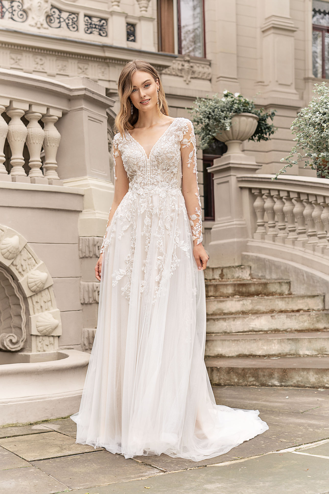 Klasyczna suknia ślubna z długim, siateczkowym rękawkiem. Koronkowa suknia ślubna idealna dla klasycznej panny młodej. Delikatnie zdobiona suknia ślubna podkreśli Twoje walory nie podkreślając mniej reprezentatywnych części Twojego ciała. Długie prześwitujące rękawki sprawdzą się idealnie dla kobiet, które czują się bardziej komfortowo w długim rękawie, a jednocześnie są fankami praktyczności - cienkie rękawki nie ograniczają ruchów. Suknia ślubna z dekoltem V i odkrytymi plecami to idealna propozycja na gorącą atmosferę towarzyszącą w tym wyjątkowym dniu. Elegancka suknia ślubna to propozycja, która nie umknie żadnej pannie młodej.