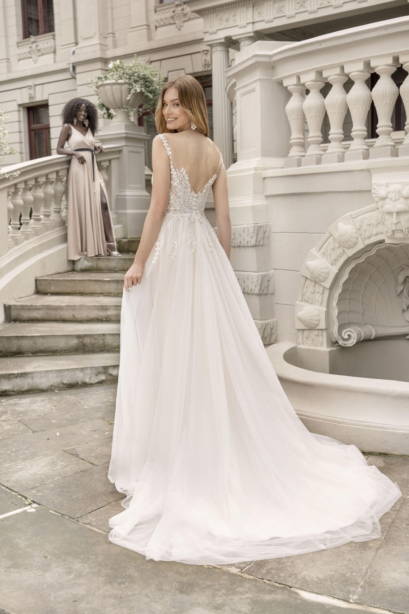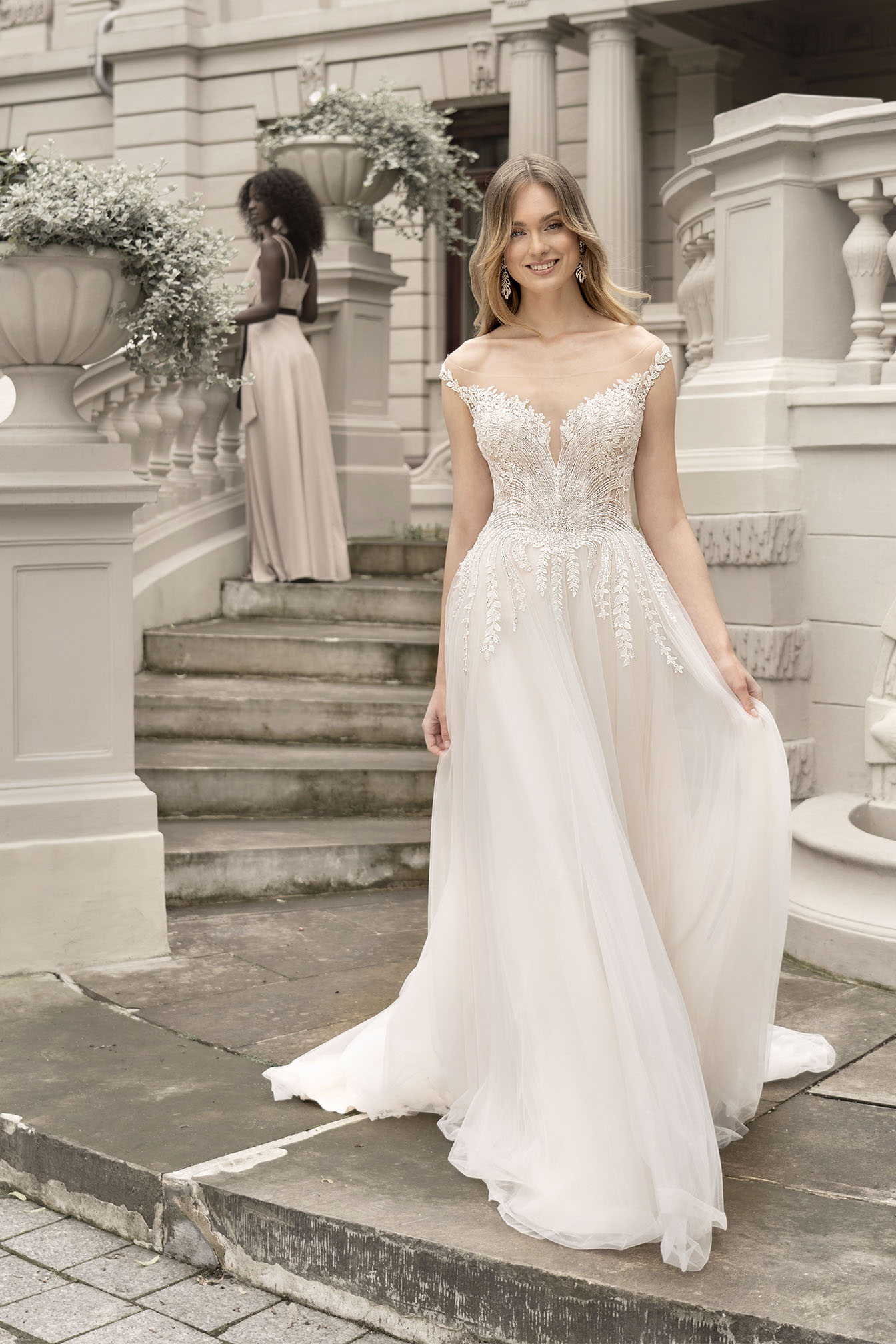 Suknia ślubna z opadającymi rękawkami o cudownym fasonie. Wyjątkowa suknia ślubna z dekoltem w łódkę jest podszyta cielistym tiulem, sprawdzi się idealnie do mniejszych piersi. Zakończenie cielistego tiulu przypomina opadające rękawki, które poszerzą lekko Twoje ramiona. Koronkowa suknia ślubna z delikatną tiulową spódnicą. Romantyczna suknia ślubna z mocno odkrytymi plecami i prosta spódnicą. Elegancka suknia ślubna z delikatnymi i eleganckimi zdobieniam spradzi się idealnie dla każdej panny młodej i na ślub w każdym stylu oraz otoczeniu!