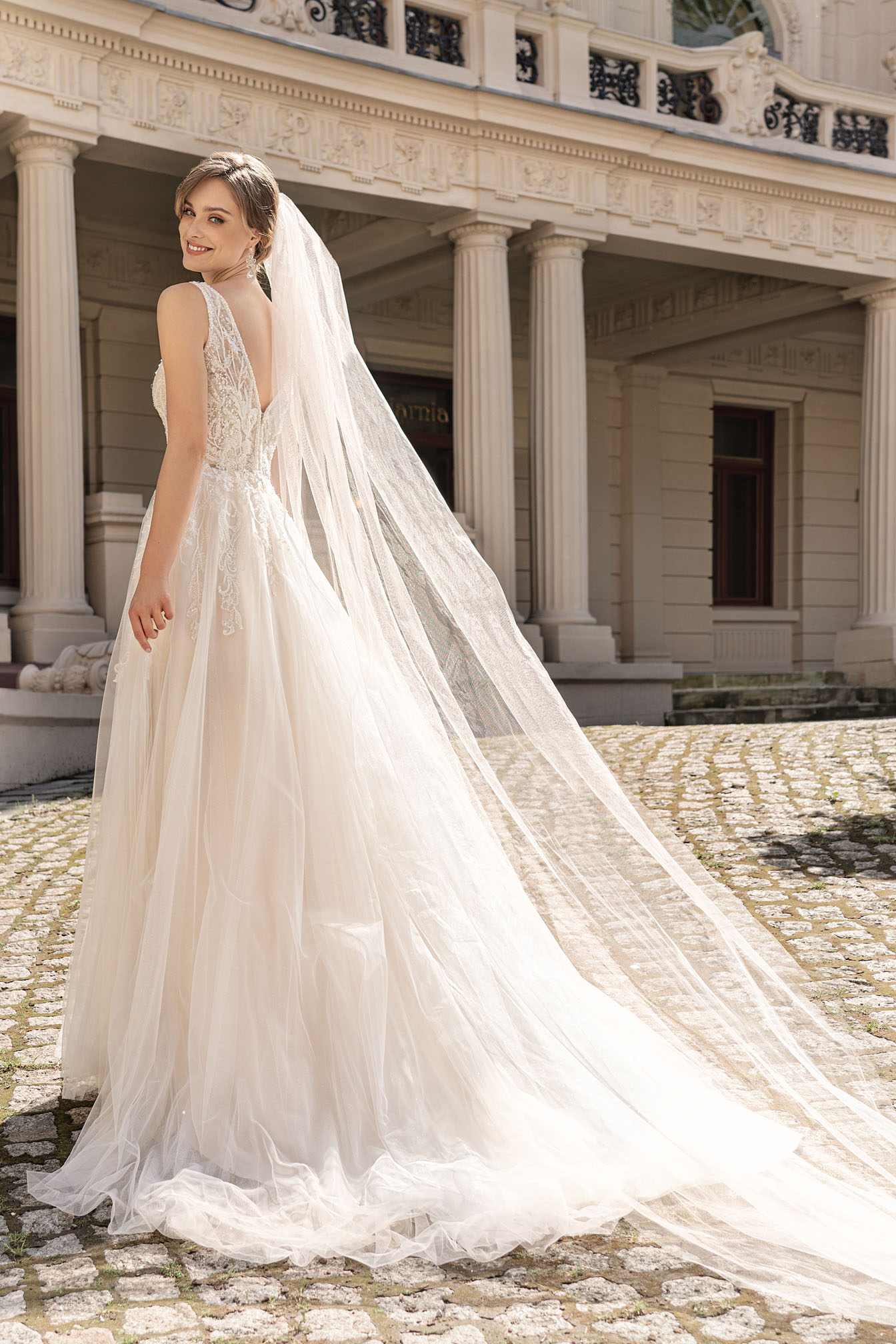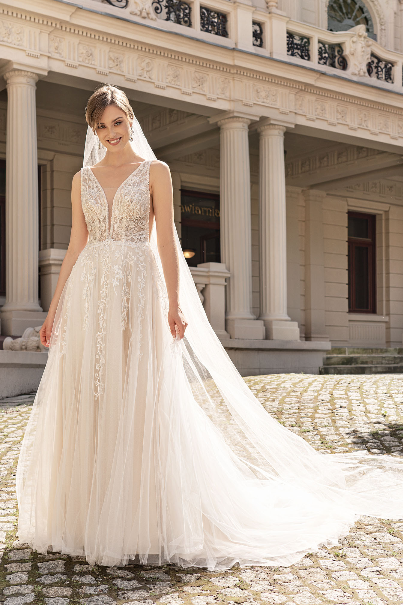 Koronkowa suknia ślubna na ramiączkach idealna dla klasycznej panny młodej. Delikatnie zdobiona suknia ślubna podkreśli Twoje walory nie podkreślając mniej reprezentatywnych części Twojego ciała. Szerokie ramiączka sprawdzą się idealnie u kobiet z węższą górą, gdyż optycznie lekko porzeszy Twoje ramiona. Suknia ślubna z dekoltem V oraz głębokim dekoltem na plecach to idealna propozycja na gorącą atmosferę towarzyszącą w tym wyjątkowym dniu. Elegancka suknia ślubna to propozycja, która nie umknie żadnej pannie młodej.