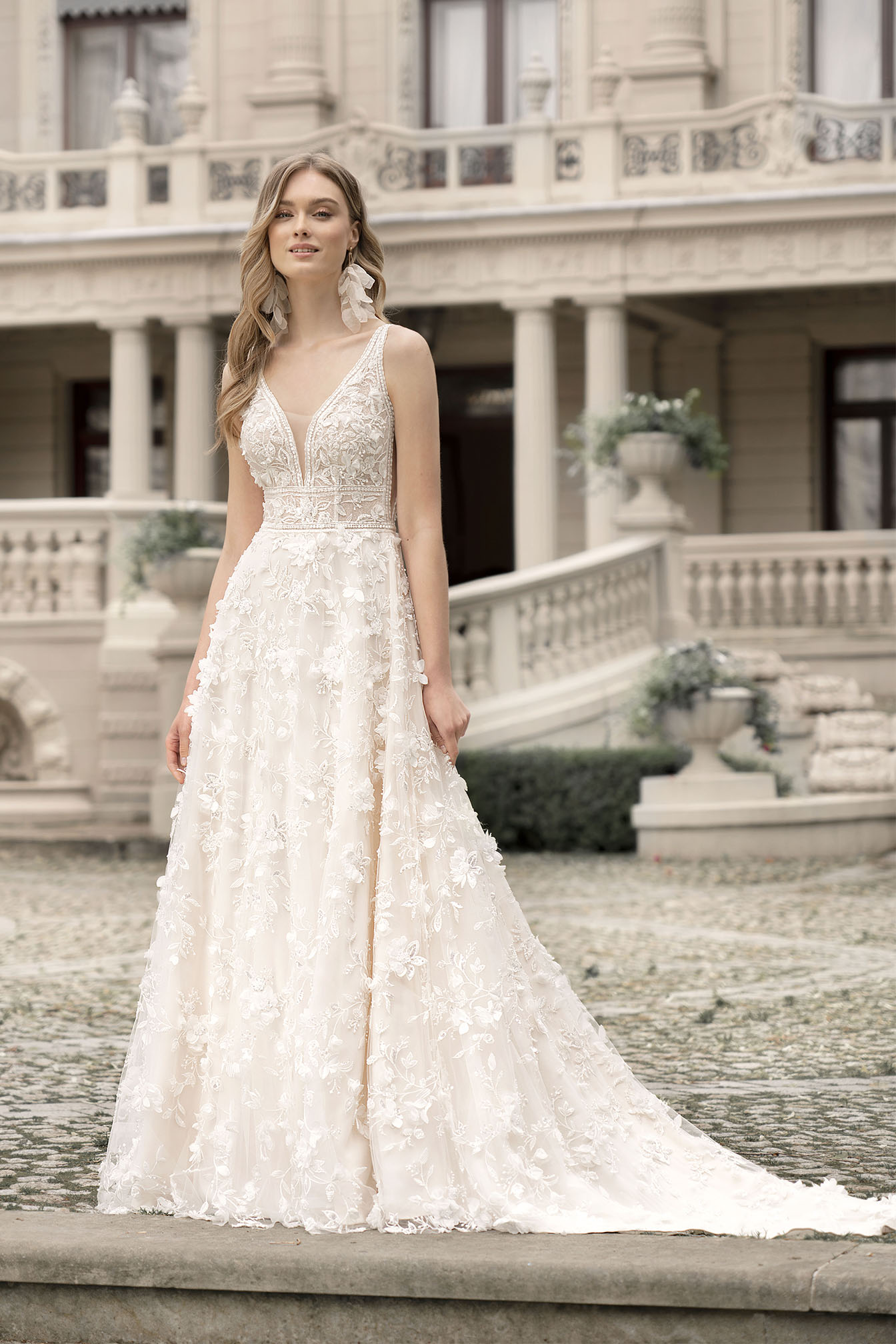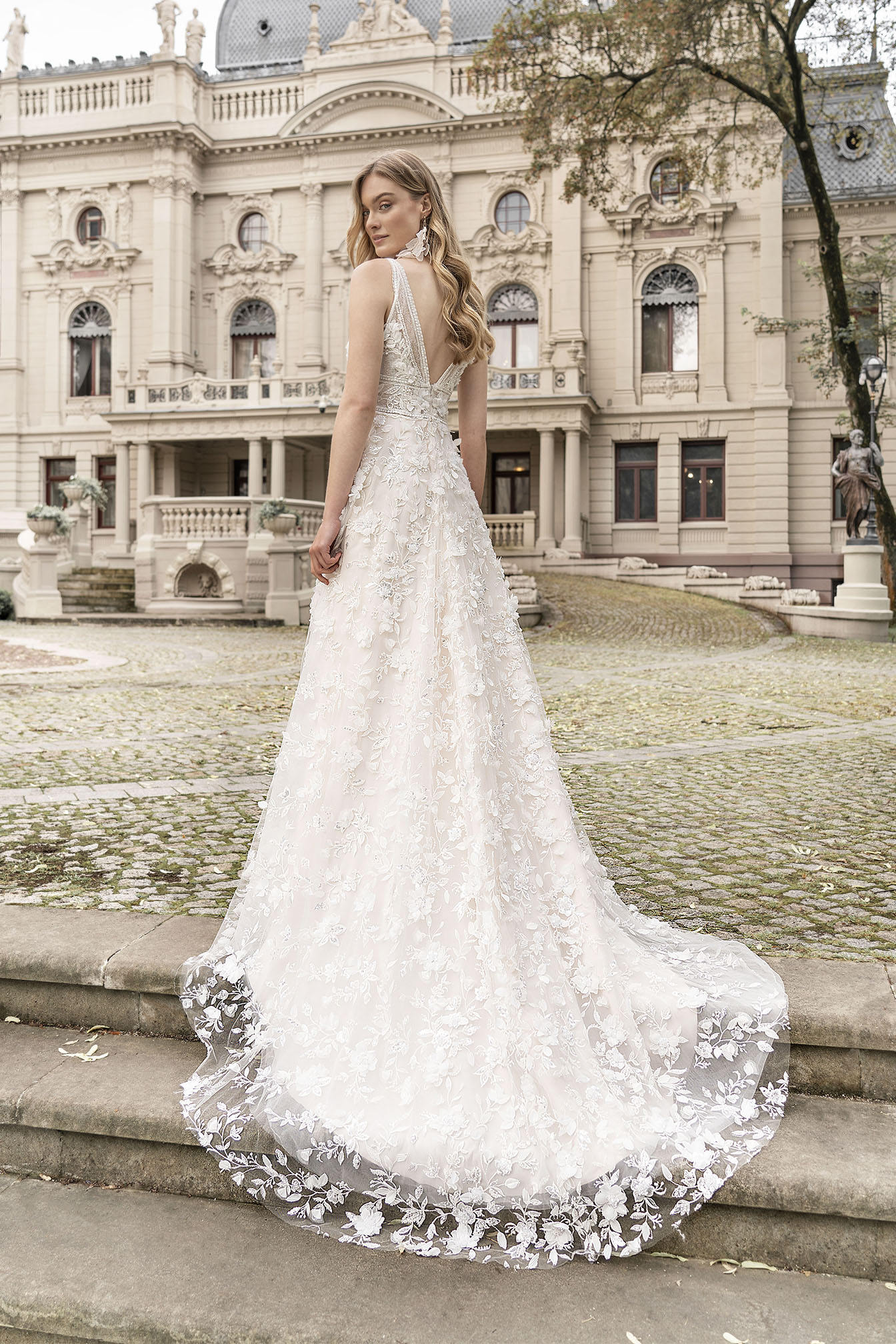 Suknia ślubna w stylu boho na ramiączkach - idealna dla klasycznej panny młodej. Suknia ślubna zdobiona płatkami i kwiatami na całej długości podkreśli Twoje walory i odciągnie uwagę od mniej reprezentatywnych części Twojego ciała. Szerokie ramiączka sprawdzą się idealnie u kobiet z węższą górą, gdyż optycznie lekko porzeszy Twoje ramiona. Suknia ślubna z odkrytymi plecami to idealna propozycja na gorącą atmosferę towarzyszącą w tym wyjątkowym dniu. Elegancka suknia ślubna to propozycja, która nie umknie żadnej pannie młodej.