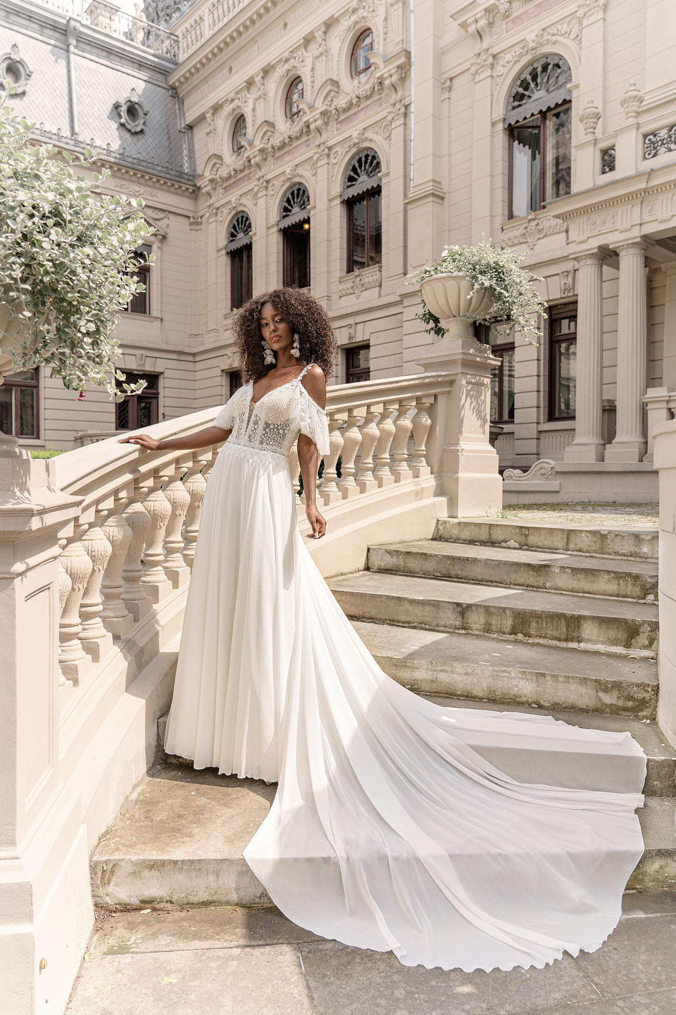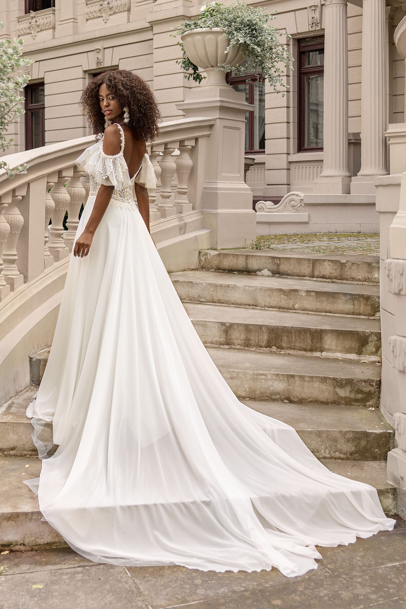 Suknia ślubna boho to propozycja idealna na ślub w plenerze, jak i na sali. Lekka, zwiewna suknia ślubna z opadającymi rękawkami podkreśli Twoją kobiecość i delikatność. Suknia ślubna z głębokim dekoltem podkreśli Twoje kształty, sprawdzi się zarówno przy większym, jak i mniejszym biuście, a odkryte plecy w tym modelu sukni ślubnej spiszą się idealnie w gorącej atmosferze ważnego dnia. Suknia ślubna boho z fiszbinami zapewni Ci komfort przez cały dzień, a delikatny koronkowy materiał nie spowoduje żadnego dyskomfortu. Wybierz swoją suknię marzeń!