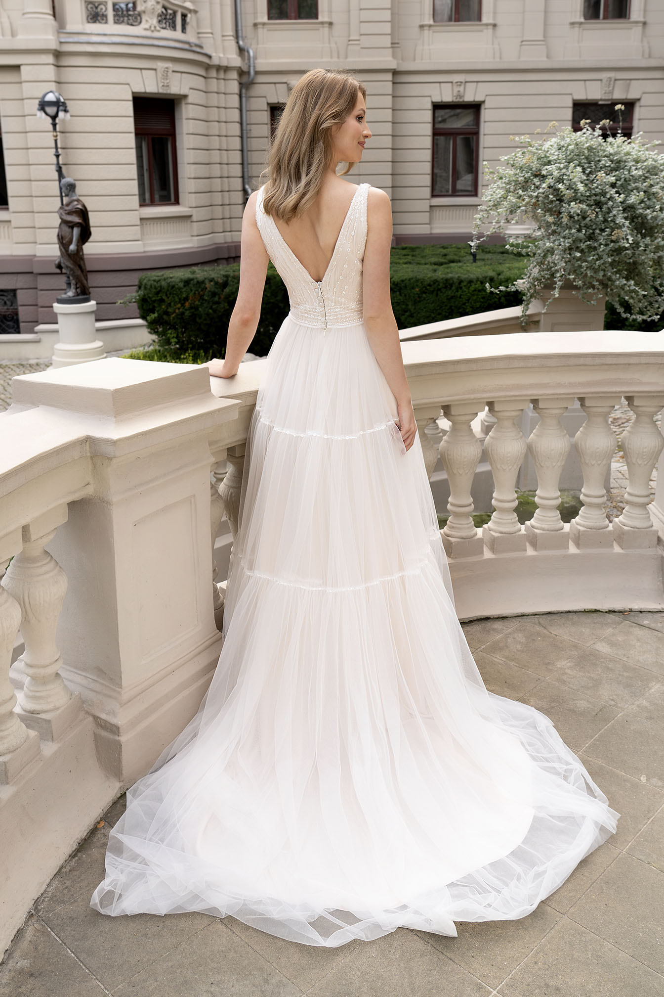 Klasyczna suknia ślubna w stylu boho na grubych ramiączkach - klasyk obok którego nie da się przejść obojętnie. Marszczony materiał sukni ślubnej nadaje jej nietypowego wyglądu, a odcięcia na spódnicy formują jej ciekawy kształt. Suknia ślubna z głębokim dekoltem wyeksponuje Twoją figurę, a dekolt V na plecach podkreśli Twoją talię! Idealna - lekka i kobieca suknia ślubna dla delikatnych Panien Młodych.