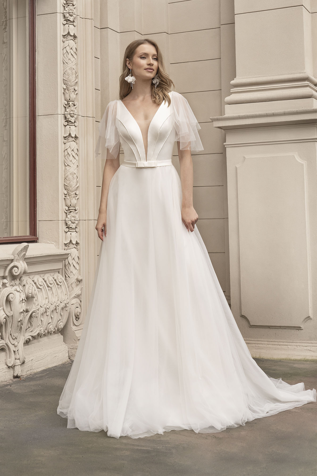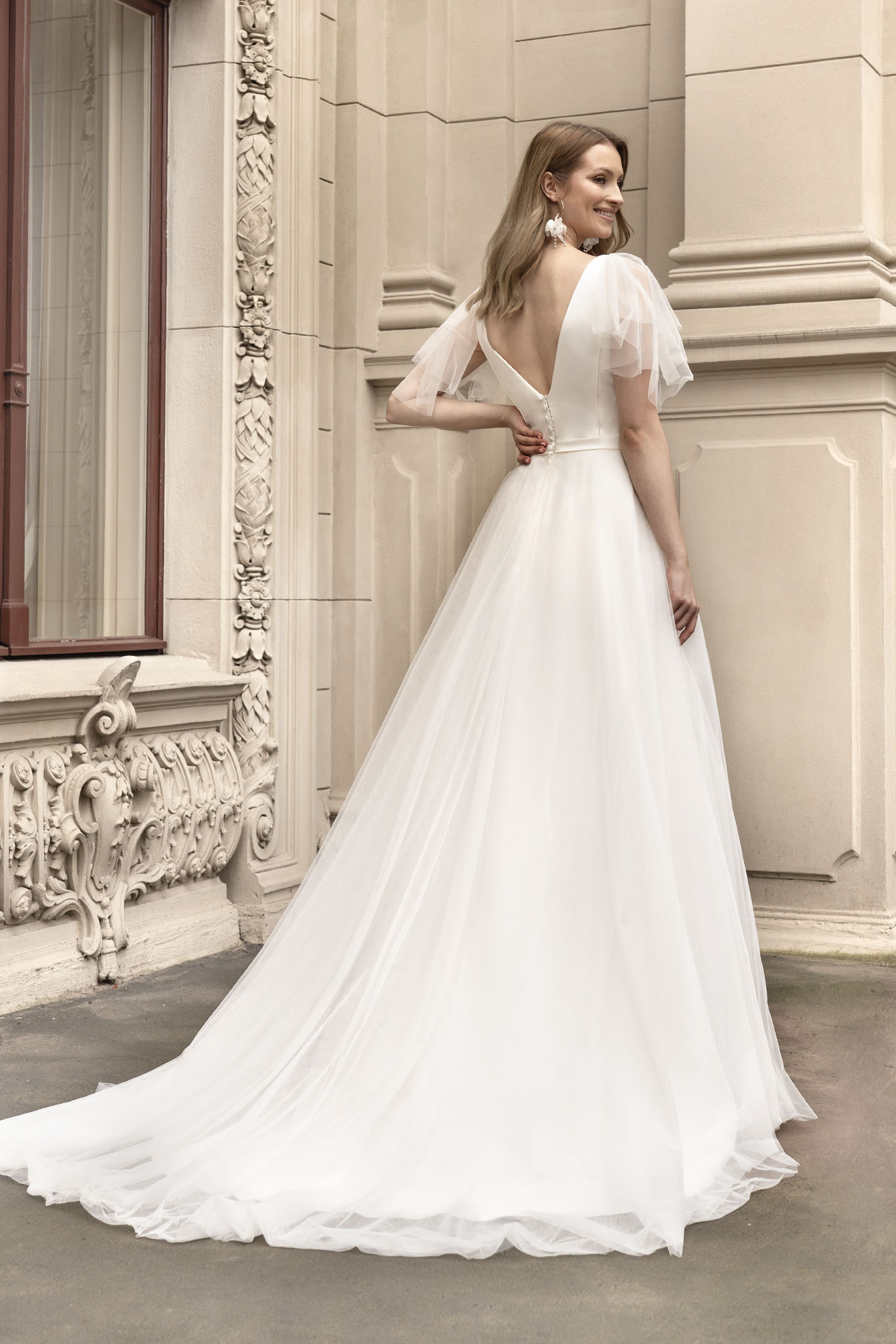 Prosta suknia ślubna na ramiączkach idealna dla klasycznej panny młodej. Szerokie ramiączka sukni ślubnej z doszytymi tiulowymi rękawkami sprawdzą się idealnie u kobiet z węższą górą, gdyż takie rękawki optycznie porzeszą Twoje ramiona w bardzo subtelny sposób. Suknia ślubna z głębokim dekoltem i odkrytymi plecami to idealna propozycja na gorącą atmosferę towarzyszącą w tym wyjątkowym dniu. Elegancka suknia ślubna to propozycja, która nie umknie żadnej Pannie Młodej.
