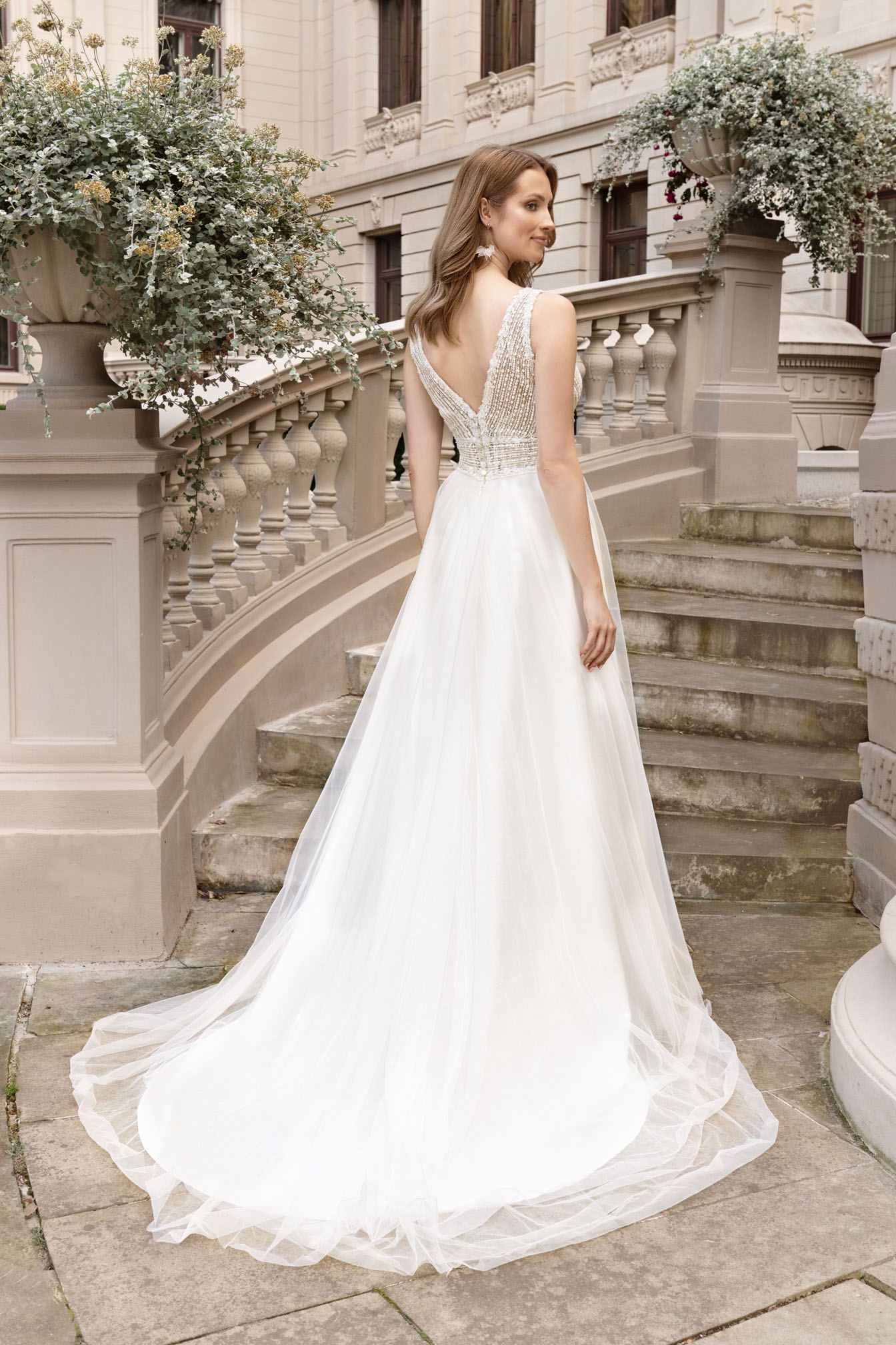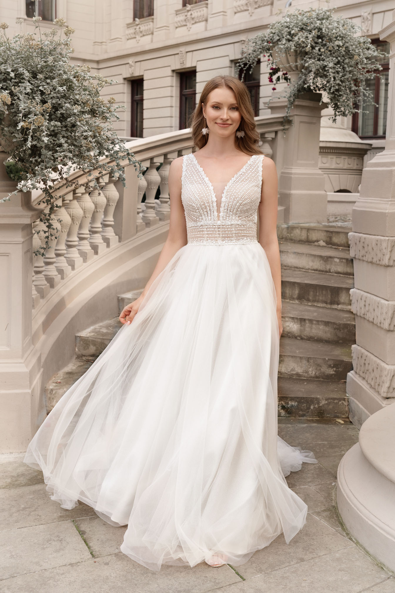 Koronkowa suknia ślubna na ramiączkach idealna dla klasycznej panny młodej. Minimalistycznie zdobiona suknia ślubna podkreśli Twoje atuty, nadając Ci wyjątkowego charakteru w dniu ślubu. Szerokie ramiączka sprawdzą się idealnie u kobiet z węższą górą, gdyż optycznie lekko porzeszy Twoje ramiona. Suknia ślubna z odkrytymi plecami to idealna propozycja na gorącą atmosferę towarzyszącą w tym wyjątkowym dniu. Elegancka suknia ślubna to propozycja, która nie umknie żadnej pannie młodej.