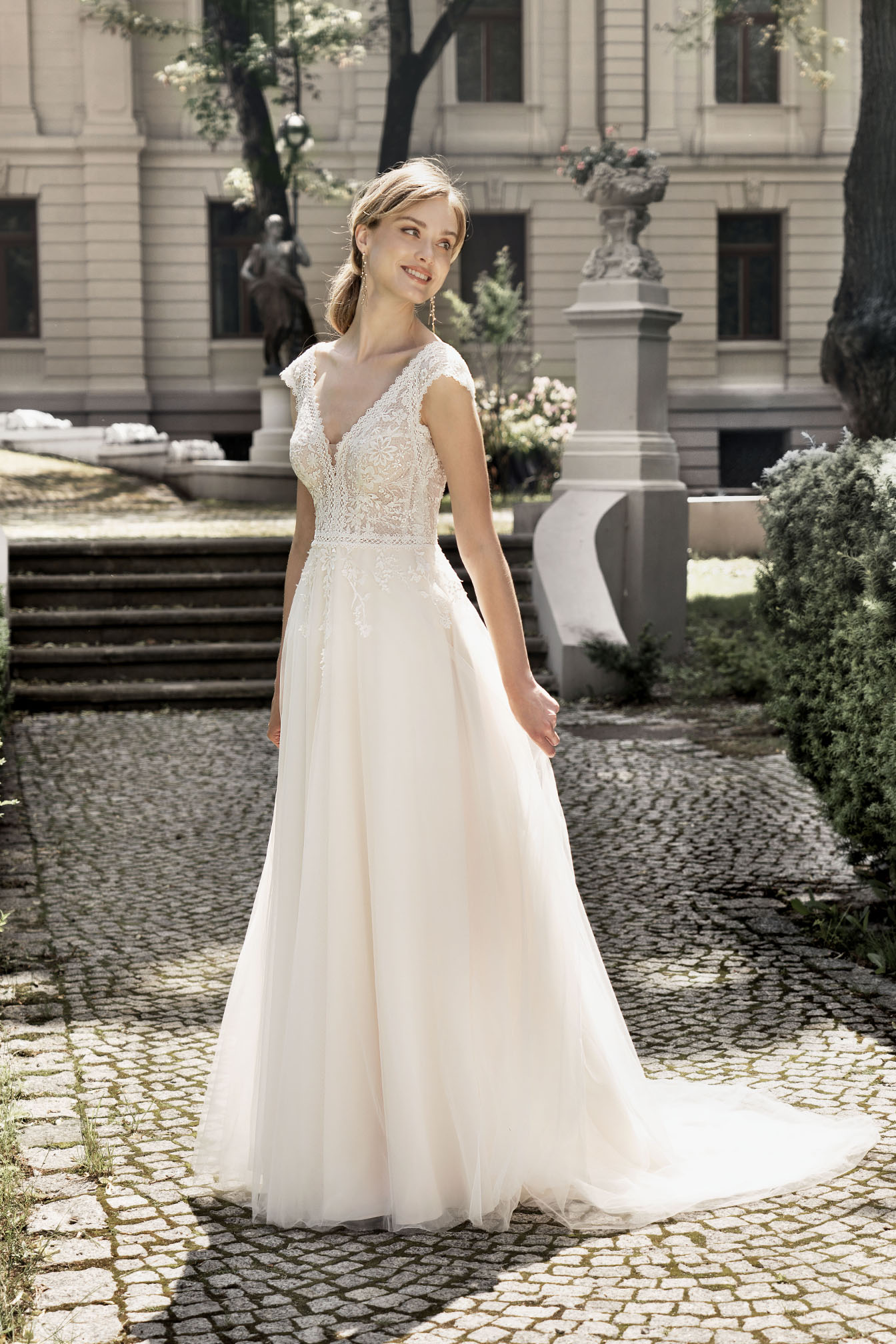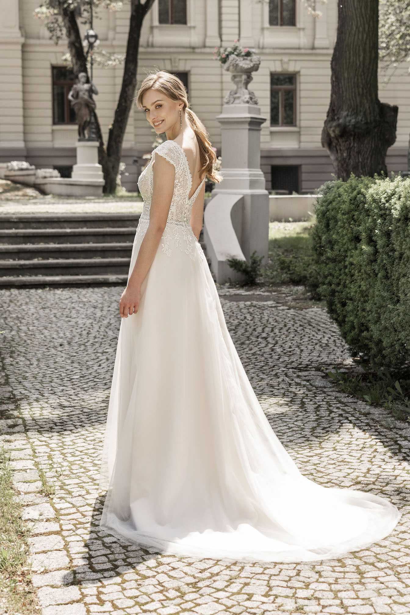 Elegancka suknia ślubna z dekoltem V to propozycja idealna dla każdej panny młodej. Klasyczna suknia w romantycznym stylu z krótkim rękawkiem sprawdzi się świetnie na ceremonii zaślubin oraz na weselu w każdym stylu. Koronkowa suknia ślubna z tiulową spódnicą sprawi, że poczujesz się wyjątkowo w tym ważnym dniu. Delikatna i zwiewna suknia ślubna pozwoli Ci na pełen komfort tak długo, ile go potrzebujesz. Suknia ślubna z odkrytymi plecami wysmukli Twoją figurę. Podkreśl swoje atuty romantyczną suknią ślubną i wyglądaj niepowtarzalnie!